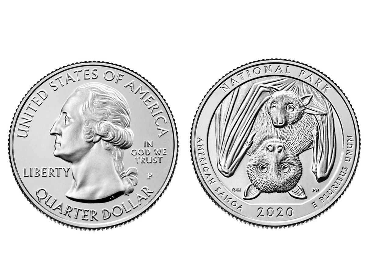 2018년, 미국 조폐국은 아메리카 아름다운 쿼터 시리즈의 일환으로 2020년 아메리칸사모아 국립공원 쿼터를 위한 여러 디자인 후보를 개발했다.[27][28] 이 디자인들은 1932년부터 쿼터 앞면에 사용된 존 플래너건의 조지 워싱턴 이미지를 포함하고 있다. 쿼터 뒷면에는 사모아 날여우 어미가 새끼를 안고 나무에 매달린 모습이 묘사되어 있으며, 이는 종의 보살핌과 서식지 손실 및 상업적 사냥으로 인한 위협에 대한 인식을 높이기 위한 것이다.[27] 이 디자인은 리처드 앨런 마스터스가 디자인했으며, 시민 주화 자문 위원회(CCAC)와 미술 위원회(CFA)에서 선정했다. 동전은 2020년 2월에 공개되었다.[27][28]