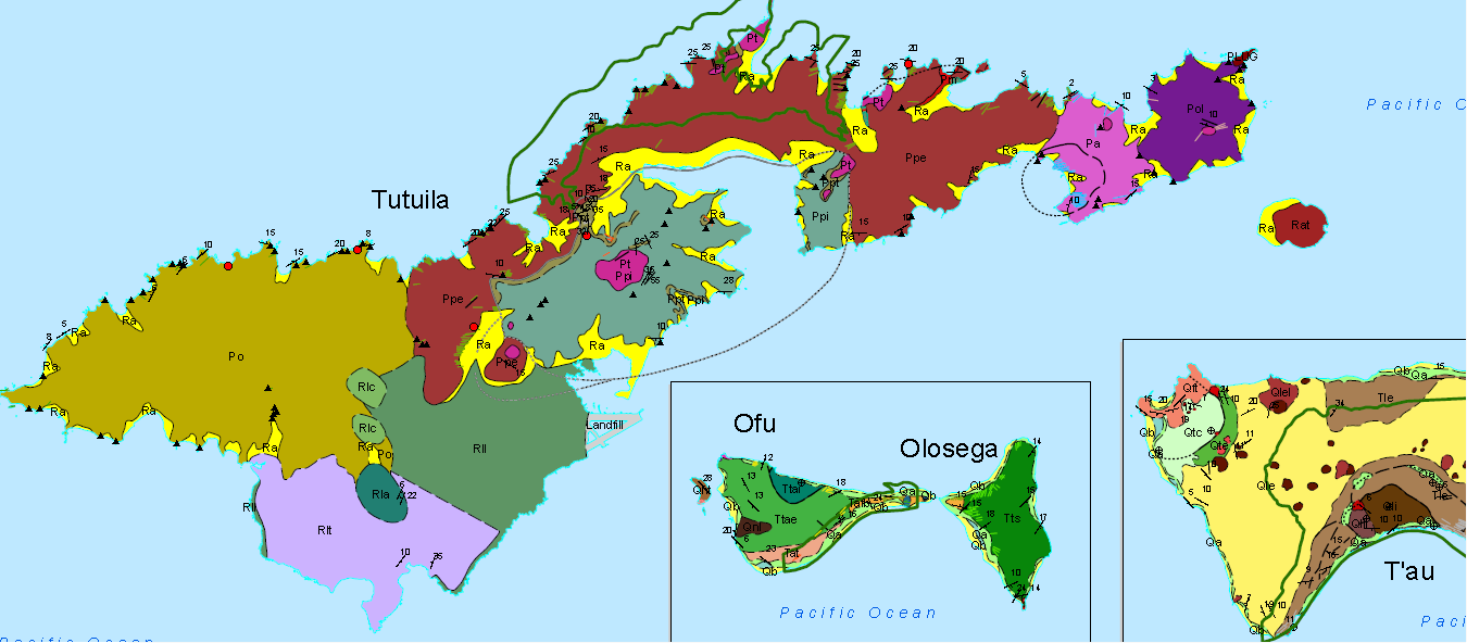 감람석 현무암은 플라이오세 또는 초기 플라이스토세에 투투일라의 현재 아포노만과 마세파이만의 방향을 따라 N. 70° E. 방향의 열곡대에서 분출되었다.[25] 마세파우 암맥 복합체와 너덜 쇄설암은 이러한 열곡의 잔해이다.[25] 타푸타푸, 파고, 알로파우, 올로모아나 순상 화산의 발달이 평행한 긴 단열을 따라 이어졌지만, 파고와 알로파우 정상이 붕괴되면서 칼데라가 형성되었다.[25] 두꺼운 응회암이 파고 칼데라에 퇴적되었고, 남쪽 가장자리는 피크라이트 현무암, 안산암, 조면암으로 구성된 용암에 의해 묻혔다.[25] 후기 플라이스토세 초기에서 중기까지의 침식으로 칼데라가 확대되었고, 특히 파고 강은 깊은 협곡을 새겼으며, 이는 오늘날 파고파고만의 전신이다.[25] 침식에 의한 유출수로 인해 해저 선반이 형성되어 섬이 600ft에서 2000ft 잠기기 전에 산호초가 발달할 수 있었다.[25] 해수면 변화는 중기에서 후기 플라이스토세까지 계속되었다.[25] 장벽 암초가 형성되어 200ft 잠긴 후 50ft 떠올라 해식 동굴이 해수면 위에 남았다.[25] 레오네 화산은 최근에 분출하여 아누누 섬과 같은 해저 응회암 원뿔과 육상의 용암 원뿔을 생성했다.[25] 파호이호이 흐름은 잠긴 장벽 암초를 덮어 섬을 8sqmi 확대했다.[25] 그 이후 섬은 5ft 더 솟아올랐다.[25]