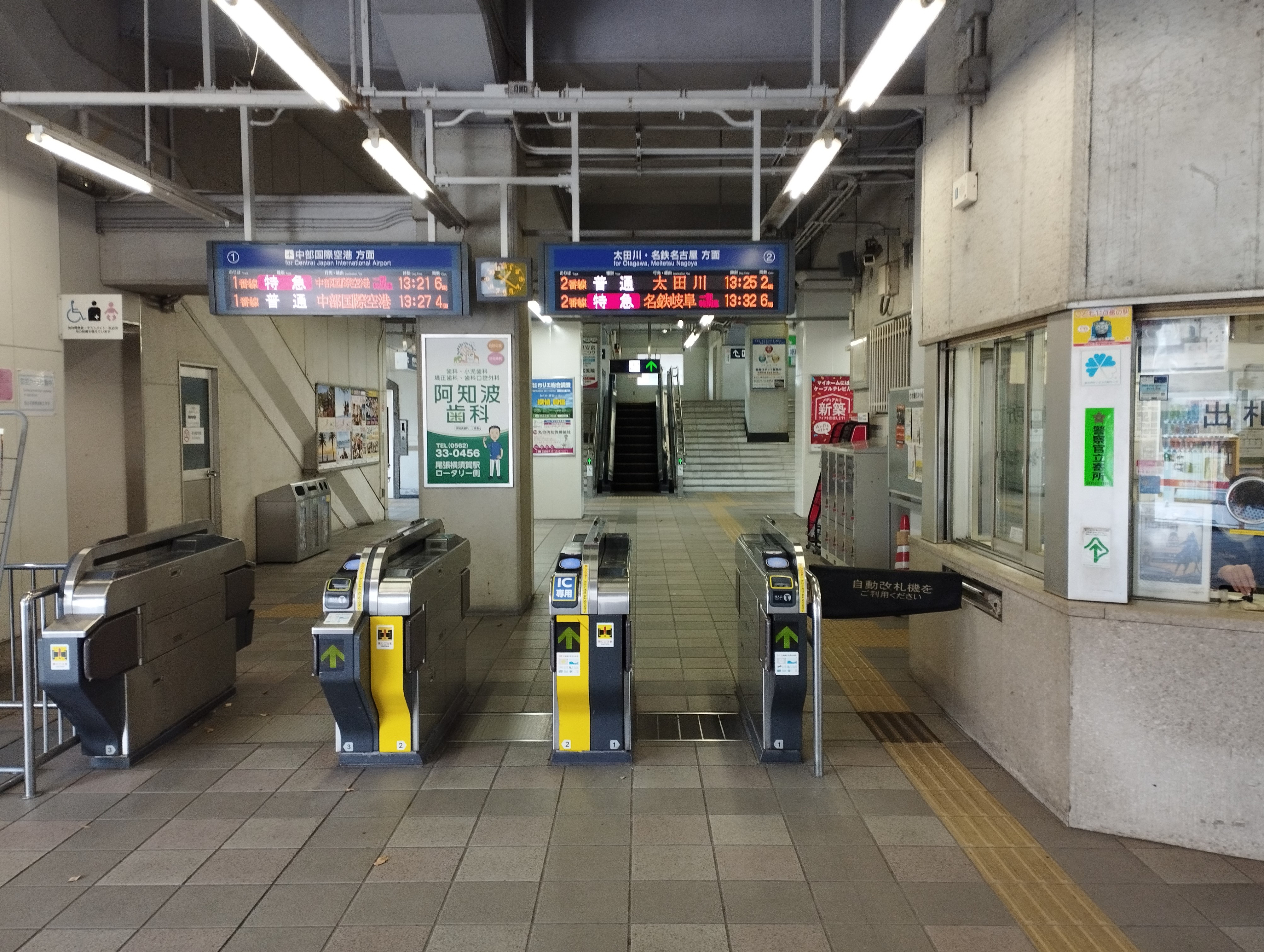 아이치현 지타시에 위치한 고미역은 1912년 개업하여 나고야 철도 소속으로 급행, 준특급, 보통 열차가 운행되는 2면 2선 구조의 역이며, 주변에 다양한 편의시설과 나고야항 관광지로의 접근성을 제공한다. - 아이치현의 철도역 - 아사히마에역