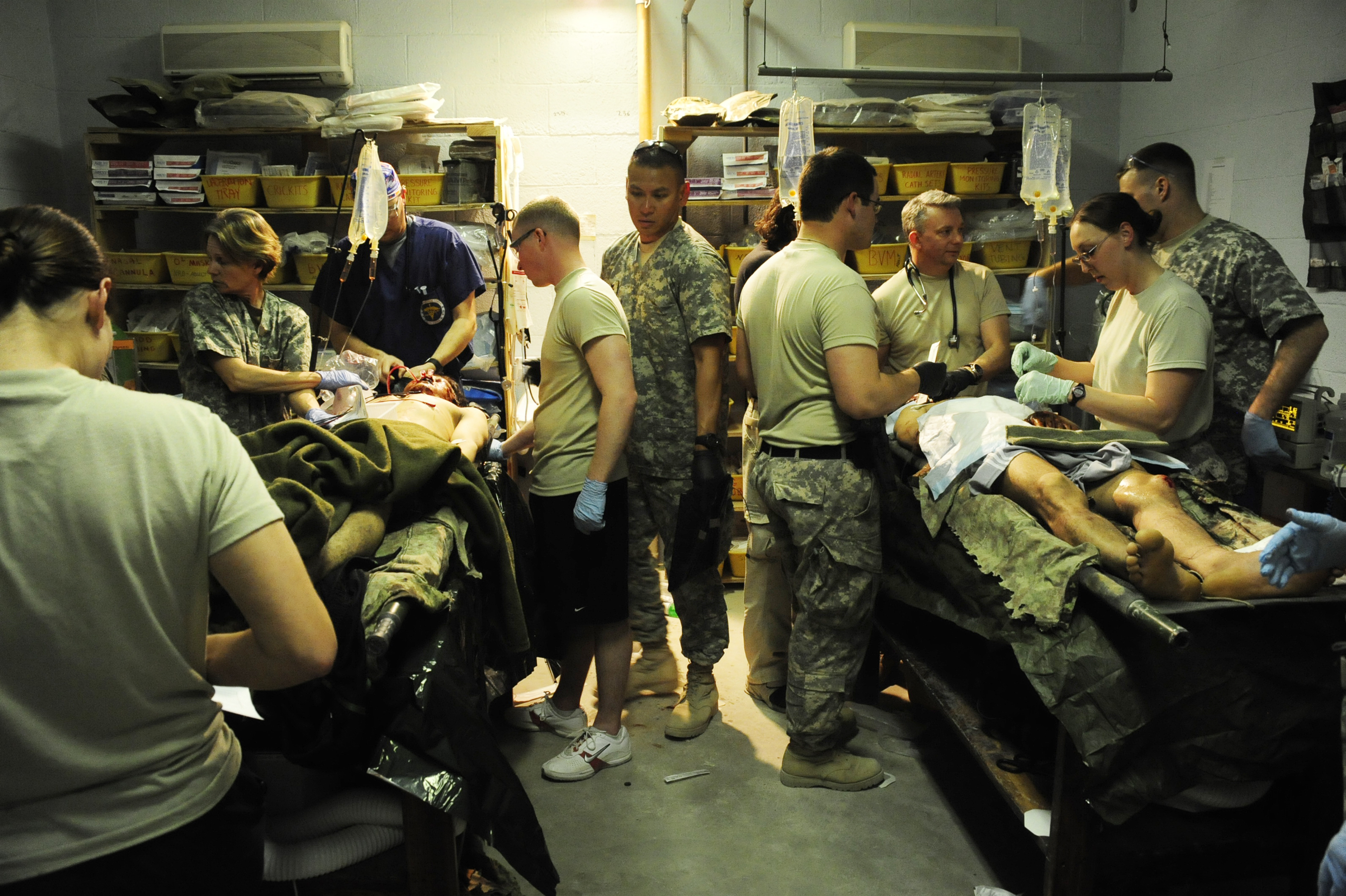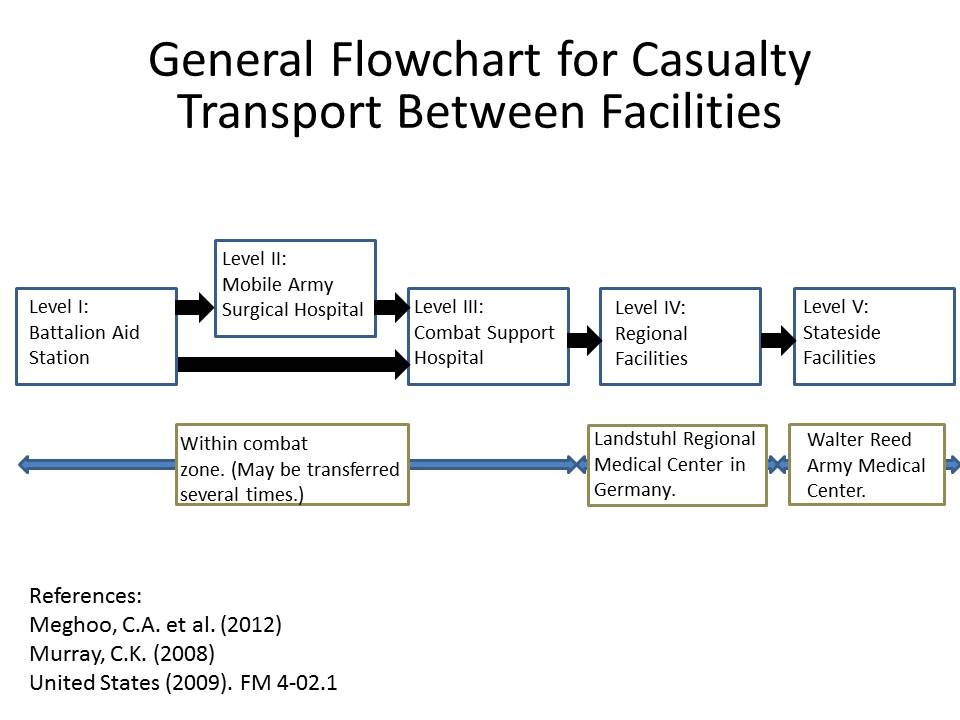 부상 군인들은 응급 처치를 위해 레벨-I 시설로 이송된 후, 부상 정도에 따라 레벨-II 시설로 이송되기도 했다. 이후 전투 지역 내 주요 병원(레벨 III)으로 이송되기 전까지 여러 시설을 거칠 수 있었다. 일반적으로 환자가 안정되면 1~3일 후 추가 치료를 위해 독일의 란슈툴 지역 의료 센터(레벨 IV)로 이송되었다. 마지막으로 부상 군인들은 재활 및 추가 치료를 위해 자국 병원으로 이송되었다.[41] 이처럼 여러 의료 환경에 반복적으로 노출되면서 ''A. baumannii'' 감염이 증가한 것으로 보인다. 다제 내성 ''A. baumannii''는 부상 군인의 치료와 재활을 어렵게 하고, 추가 사망으로 이어지기도 했다.[7][42][43]