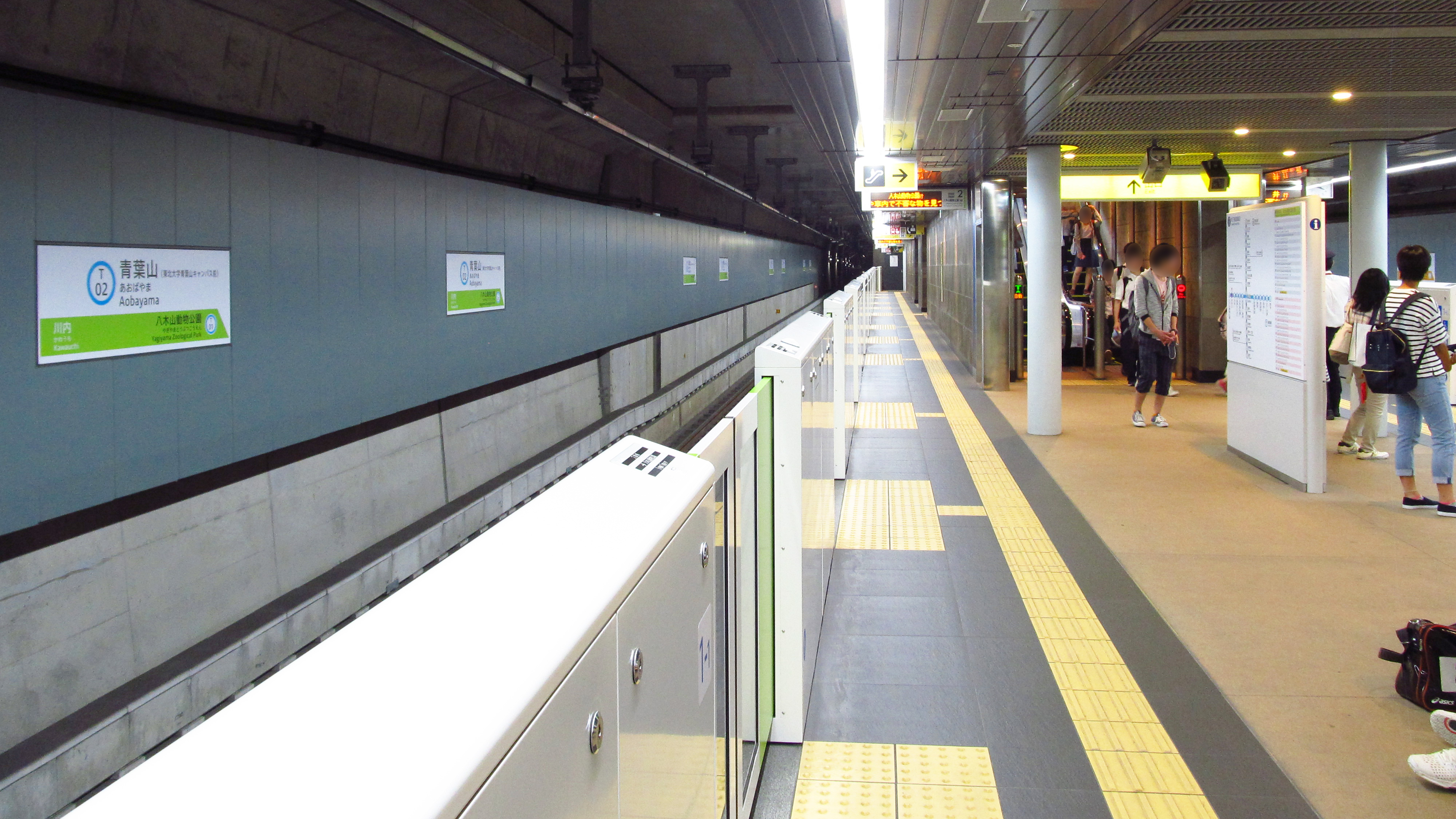 아오바야마 역은 지하 6층(깊이 약 34m)에 2개의 선로를 갖춘 상대식 승강장 1면을 갖추고 있다. 개찰구는 지하 1층에 있고, 역 북쪽에는 아오바야마 변전소가 설치되어 있다. 출구는 북쪽과 남쪽, 총 2곳이 있다.