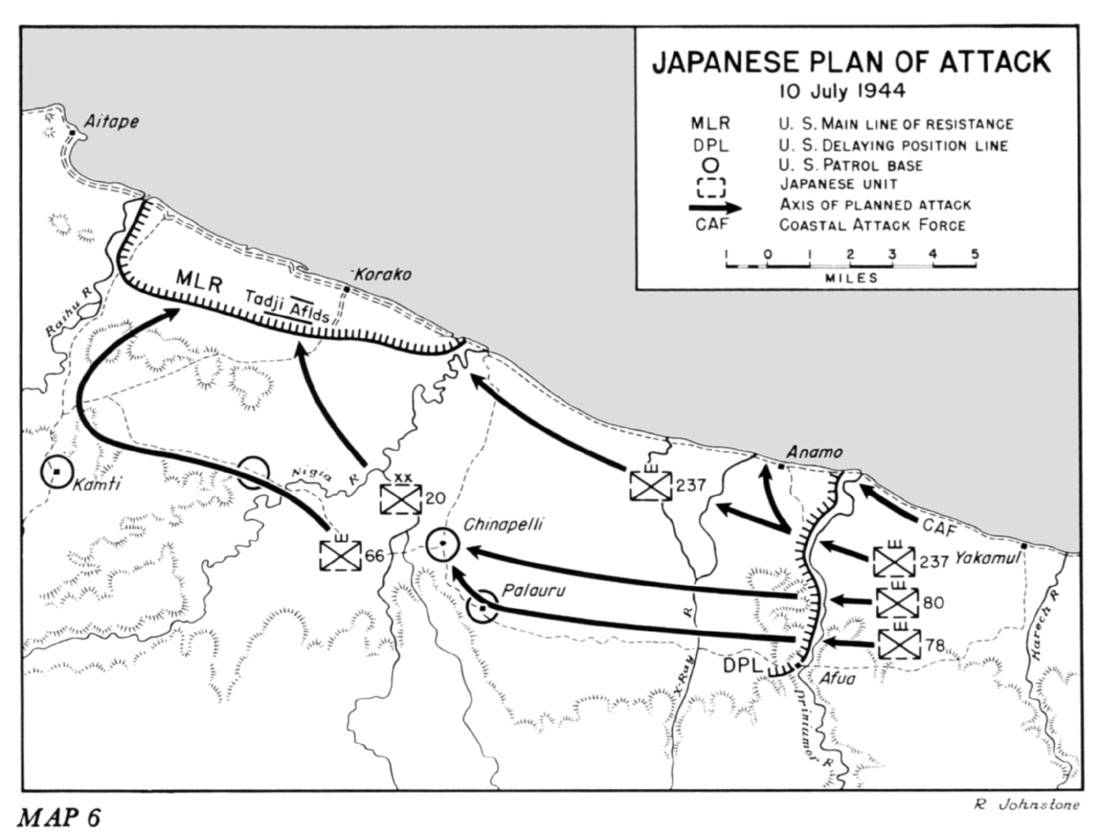 암호 해독과 노획된 문서, 연합 정보국 순찰 및 기타 소스로부터 얻은 정보는 일본 제18군이 연합군 방어선을 돌파하여 아이타페를 탈환할 의도로 드리니모어(일본군은 ''한토''[7]라고 불렀다)에 접근하고 있음을 나타냈다.[8][9] 전투에 앞서, 일본군은 서쪽 보급선을 구축하고 웨왁에서 60km의 도로를 건설했으며, 수송 작전을 보호하기 위해 일련의 해안 방어 시설을 설치했다. 그럼에도 불구하고, 보급품은 약 7,000명의 병력이 수작업으로 운반해야 했다.[10] 제18군은 6월 초 현재 주요 전투에 필요한 일본군 군수 매뉴얼에 명시된 탄약의 절반만을 가지고 있었으며, 병사들은 평소의 절반의 식량을 받았다.[11]