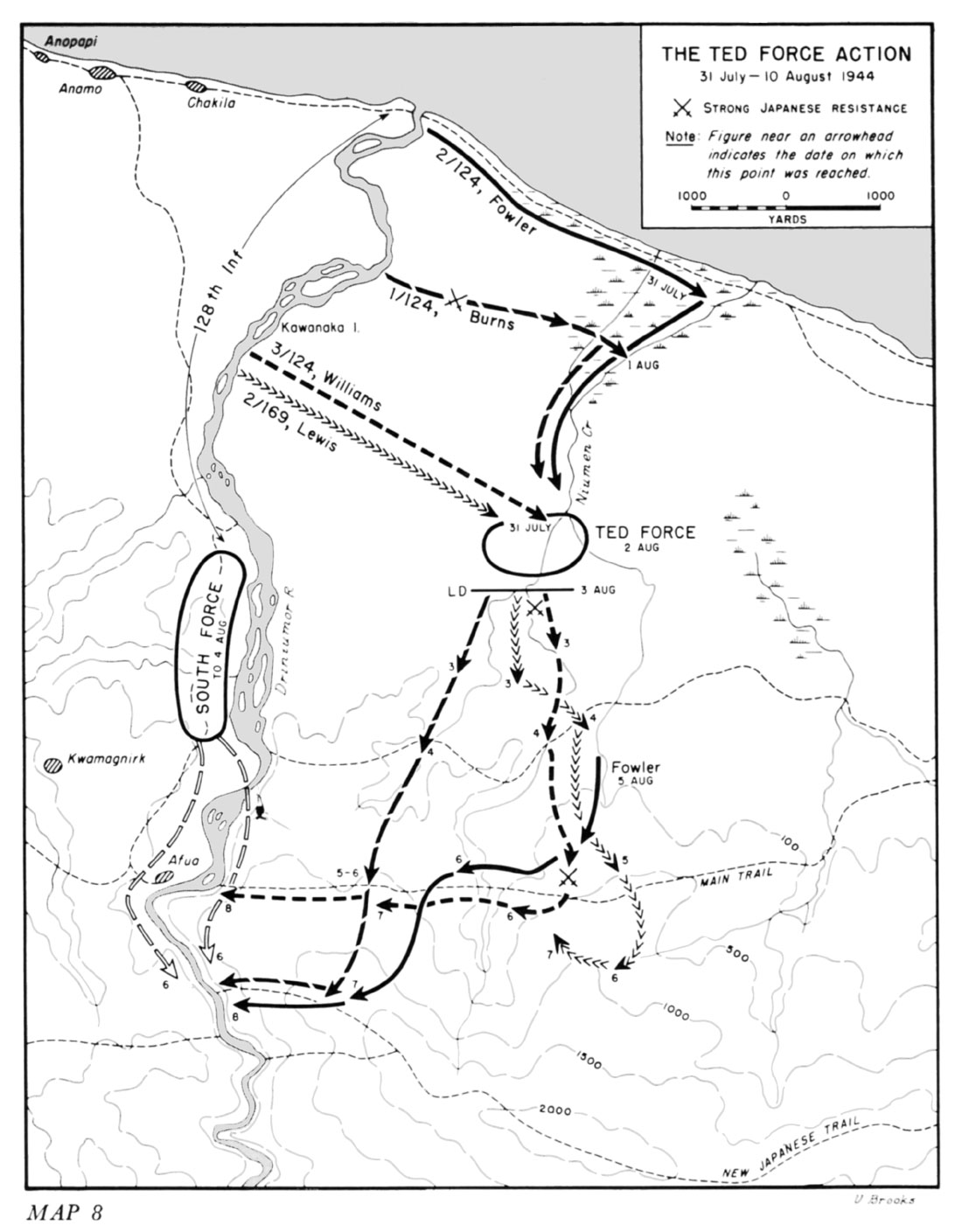 7월 29일에서 31일경, 미군은 반격을 준비했다. 제124, 169보병연대가 연합군 북쪽 해안에서 드리니모르 강 동쪽으로 진격, 니우멘 크릭까지 간 후 남쪽으로 선회하여 서쪽으로 이동, 미군 남쪽 측면을 공격하는 일본군을 포위하는 작전이었다.[36] 8월 초, 아푸아에 대한 일본군 공격은 약화되어 동쪽으로 밀려났다. 해안 근처 일본군 우익은 방어 자세로 전환, 강력히 저항한 후 야카물과 말집 주변에서 재보급 및 재편성을 시도했다.[33]