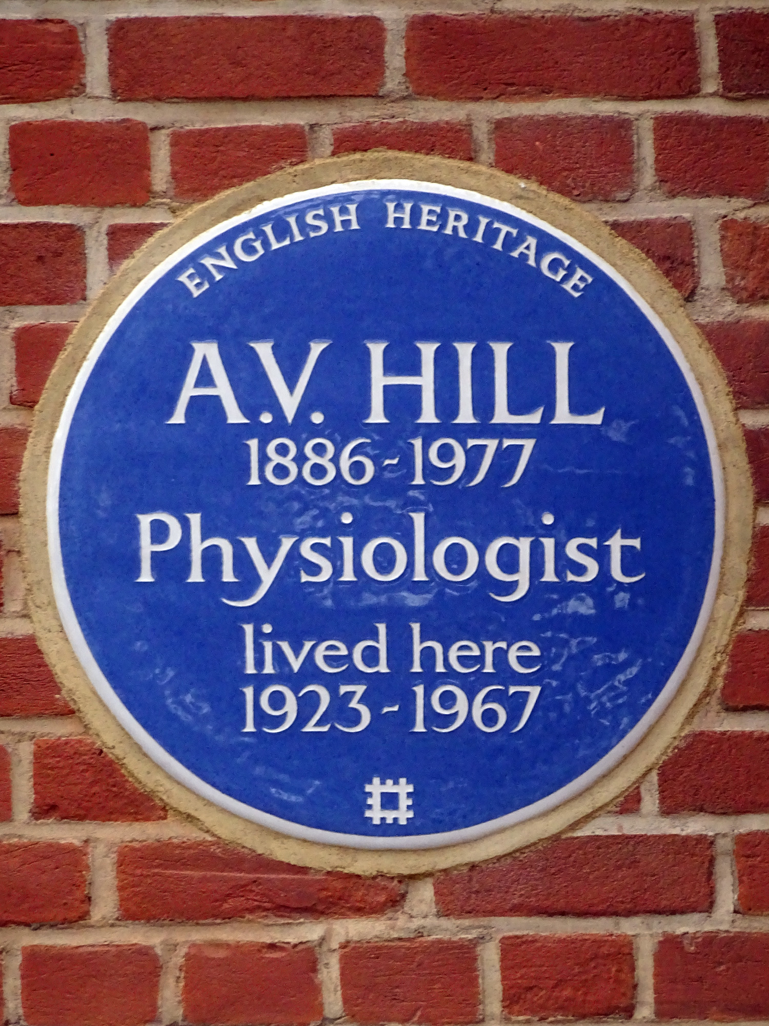 블루 플라크를 제안한 왕립 학회(FRS)의 랄프 콘 경은 "노벨상 수상자 A. V. 힐은 근육 생리학에 대한 우리의 이해에 크게 기여했다. 그의 연구는 스포츠 의학에서 광범위한 적용으로 이어졌다. 그는 뛰어난 인도주의자이자 국회의원으로서, 과학자와 다른 사람들에 대한 나치 정권의 박해를 단호히 비난했다.[28] A. V. 힐은 많은 난민들이 이 나라에서 그들의 연구를 계속할 수 있도록 돕고 구출하는 데 중요한 역할을 했다"고 말했다.[29][30][31]