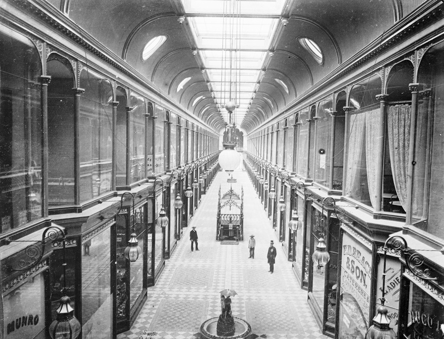 쇼핑 아케이드는 시끄럽고 지저분한 거리에서 벗어나 날씨와 상관없이 따뜻하고 건조한 공간에서 쇼핑과 사교 활동을 즐길 수 있는 장소를 제공했다. 19세기 중반까지 아케이드는 패션과 사교의 중심지가 되었으며, 중산층에게 인기 있는 오락거리가 되었다.[9]