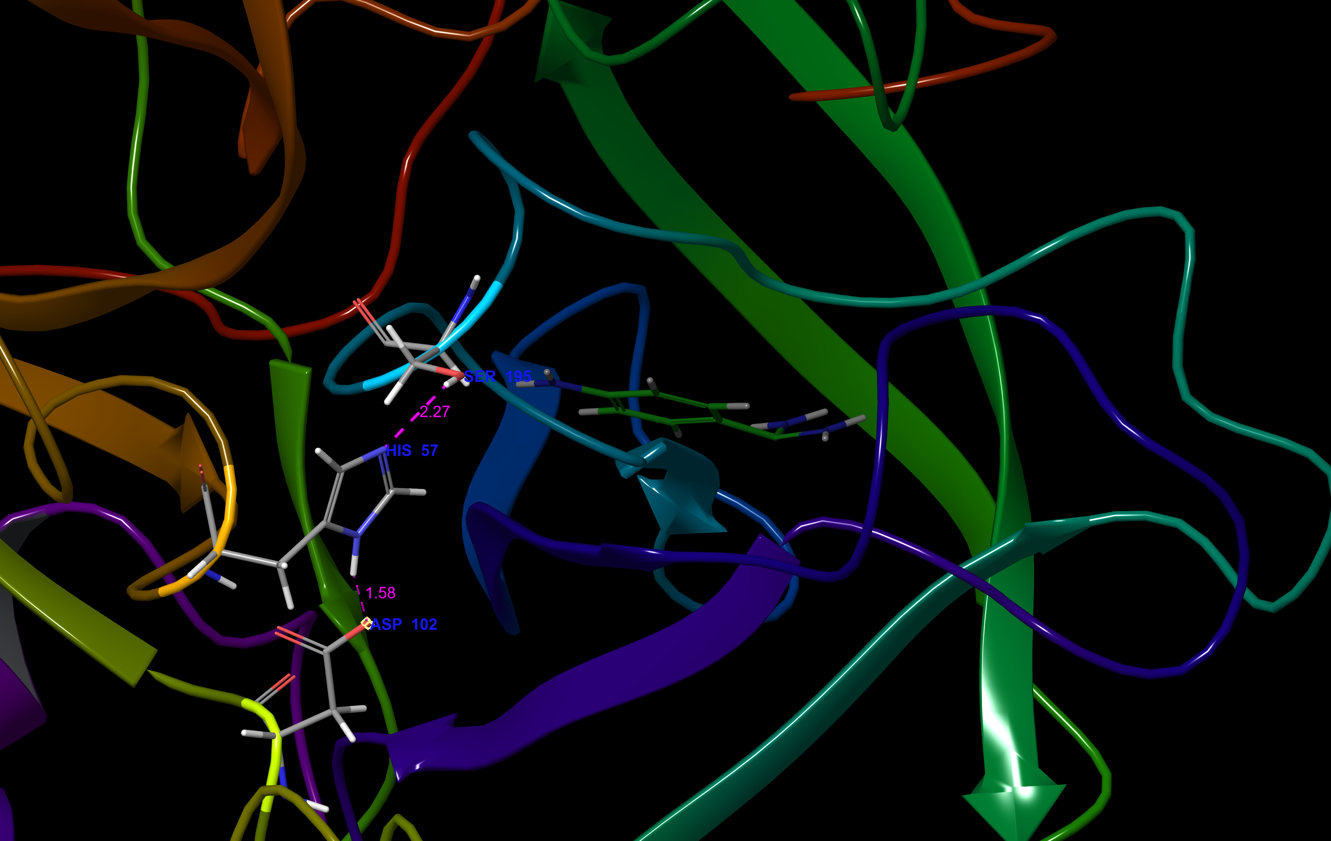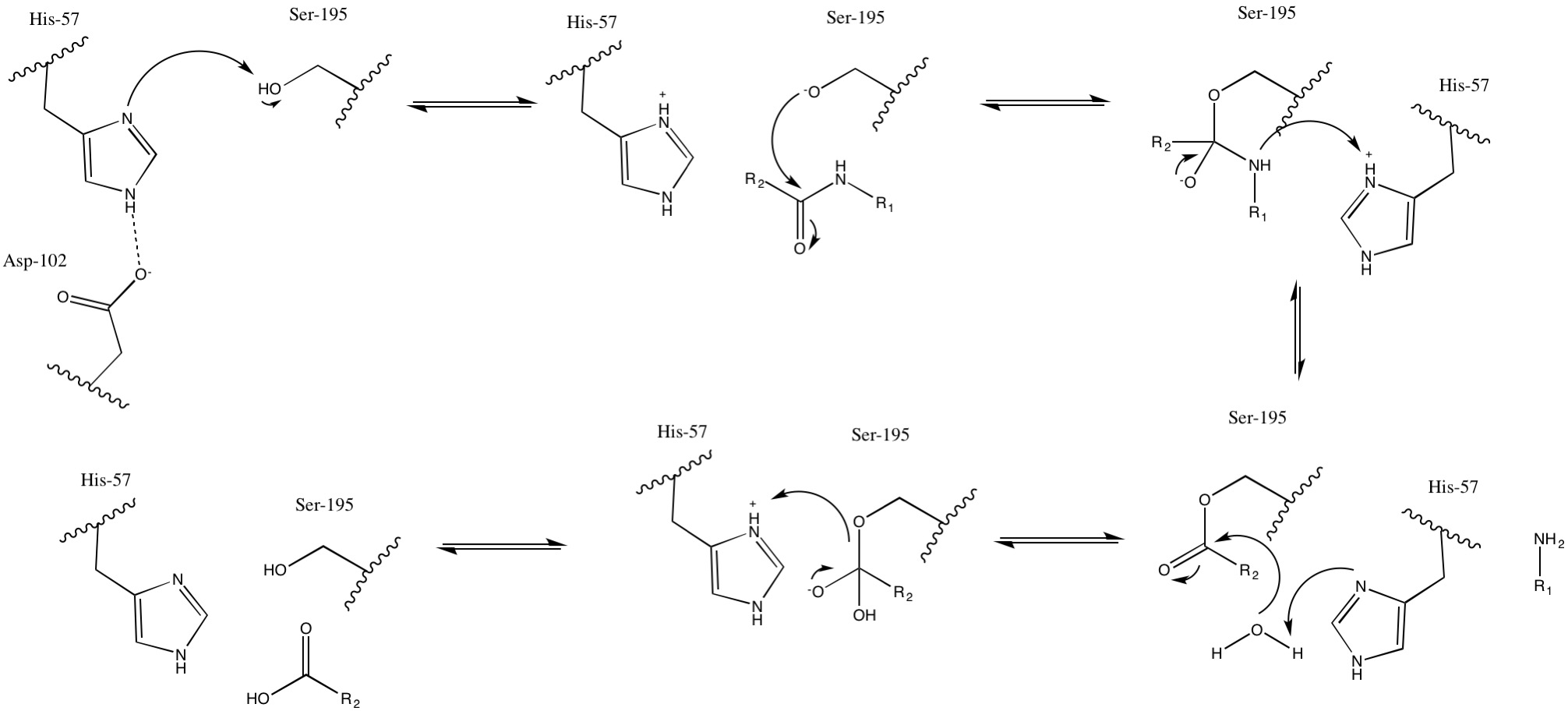 반응은 일반적인 세린 프로테아제 메커니즘에 따라 진행된다. 먼저 His-57이 Ser-195를 탈양성자화하여 친핵성을 증가시킨다. 탈양성자화된 Ser-195가 펩타이드의 카르보닐 탄소를 공격하여 사면체 중간체를 형성한다. 이 사면체 중간체가 붕괴하면서 His-57이 H2N-R1 이탈기를 양성자화시킨다. His-57이 물 분자를 탈양성자화시키고, 활성화된 물 분자가 카르보닐 탄소를 공격하여 두 번째 사면체 중간체를 형성한다. 사면체 중간체가 붕괴하면서 Ser-195가 이탈하고, His-57이 Ser-195를 양성자화시켜 촉매 전 상태로 복귀하며, 펩타이드 결합이 끊어진 자리에 카르복실산이 생성된다.[3]