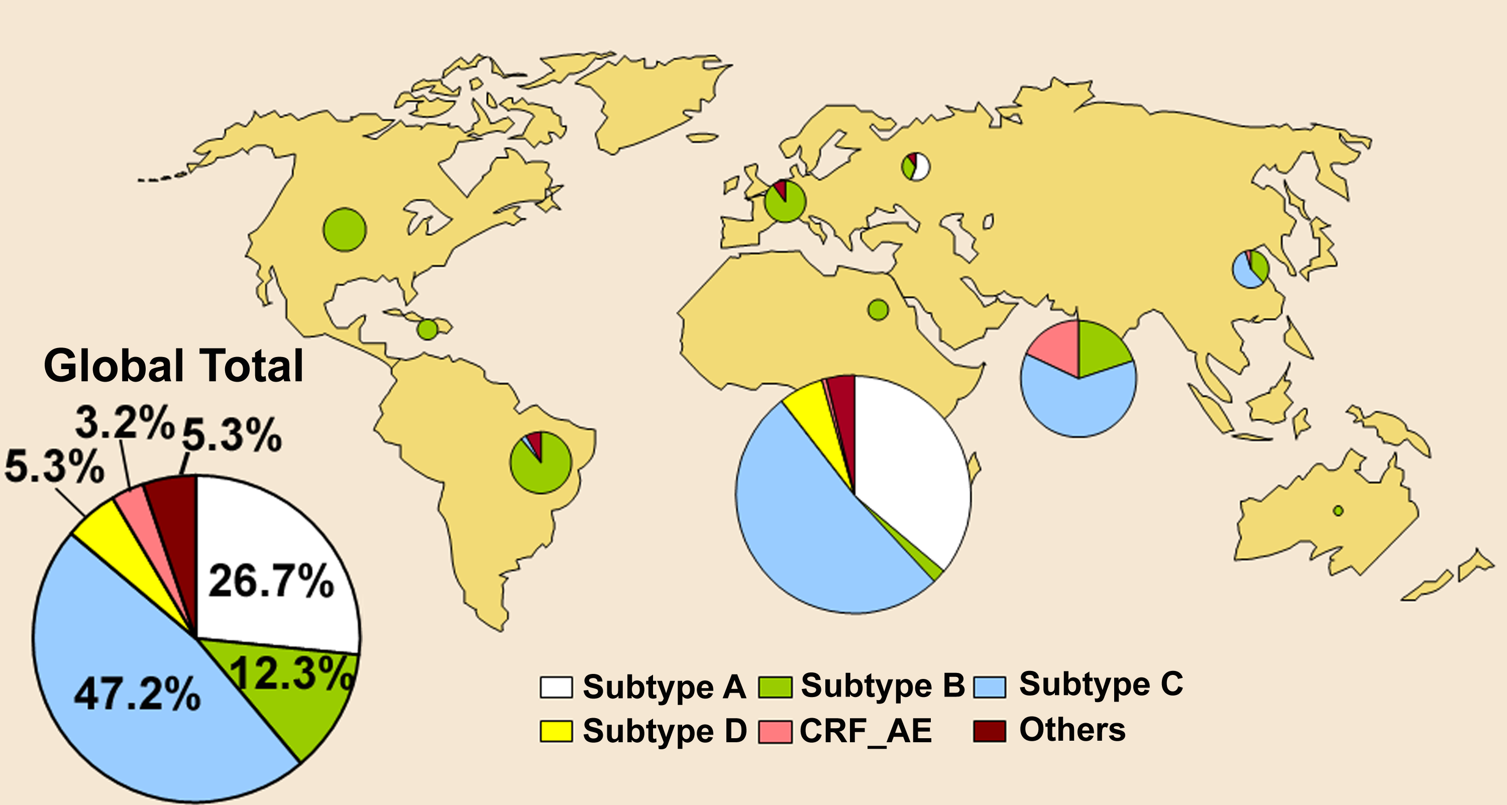 HIV는 여러 아형으로 나뉘는데, 그중 A형과 C형이 아프리카에서 가장 널리 퍼져 있다. 특히 C형은 전 세계 HIV 감염의 약 50%를 차지할 정도로 두드러진다.[68][69] 그러나 HIV 연구의 대부분은 주로 유럽에서 발생하는 B형(전체 감염의 12%)에 초점을 맞춰왔기 때문에,[70] C형이 다른 아형에 비해 바이러스 전염을 증가시키는 요소를 진화시켰는지 여부는 아직 불분명하다.[70]