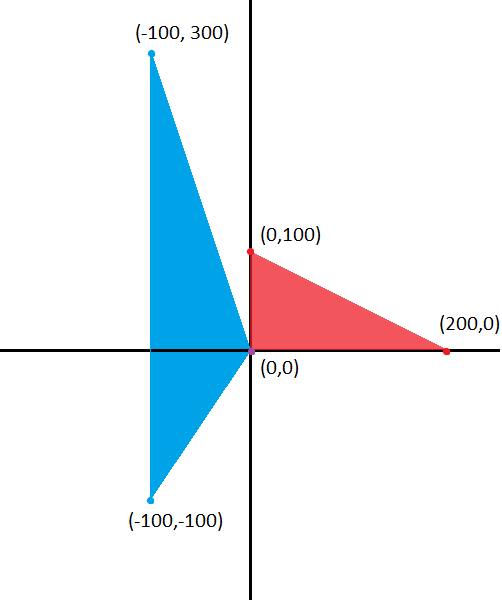 원래 삼각형(빨간색)의 세 꼭짓점을 변환하면 새 삼각형(파란색)의 세 점이 만들어진다. 이 변환은 원래 삼각형을 비틀고 이동시킨다. 모든 삼각형과 평행사변형은 아핀 변환을 통해 서로 연관될 수 있지만, 모든 사변형이 그런 것은 아니다.