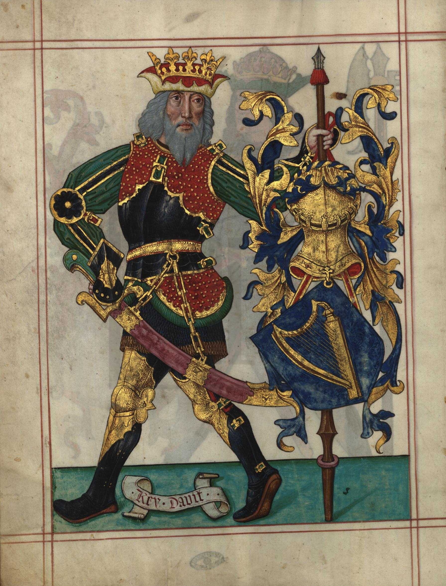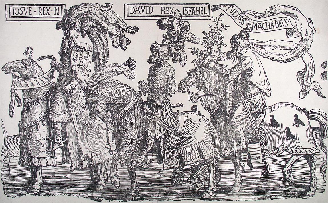 1459년 잉게람 코덱스는 아홉 위인의 문장을 더 큰 규모의 모범적인 개인의 귀속 문장 목록과 함께 제시하는데, 세 명의 "더 나은 유대인", "최고의 이교도", "최고의 기독교인"과 함께 다윗 왕의 세 영웅에게 귀속된 문장( "최초의 문장"으로 표기됨), 동방 박사, "세 명의 가장 온순한 군주", "세 명의 최악의 폭군"( 느부갓네살, 안티오코스 4세 에피파네스, 네로), "세 명의 인내심 있는 자"( 알폰소 현왕, 욥 및 성 에우스타키우스), "세 명의 기름 부음받은 왕"(프랑스, 덴마크, 헝가리)과 "세 개의 고귀한 왕조"( 프랑스의 루이 11세, 프랑스의 도팽인 "신중한 루이", 헝가리의 라슬로 1세, 브라운슈바이크-뤼네부르크 공작 오토 3세 (벨프 가문)가 있다.