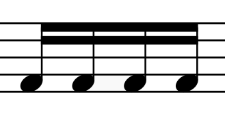 잇단음표 8분음표(콰버) 이하의 음표는 길이를 나타내기 위해 꼬리표가 있지만, 잇단음표를 사용하여 이 음표들을 묶을 수 있다. 이는 일반적으로 리듬 그룹을 나타내기 위해 사용되지만, 미터가 없는 부분의 음표를 연결하는 데에도 사용될 수 있다. 잇단음표의 수는 음표의 꼬리표 수와 같다. 8분음표는 1개의 이음줄로, 16분음표는 2개의 이음줄로 묶인다. 오래된 보컬 음악 인쇄물에서는 잇단음표는 때때로 한 음절의 텍스트로 불리는 음표에만 사용된다 (멜리스마). 그러나 현대 보컬 음악의 표기법은 기악 악보와 일관된 방식으로 잇단음표를 사용하는 것을 권장한다. 전통적이지 않은 박자에서는 잇단음표는 작곡가와 편곡자의 재량에 따라 리듬 패턴을 강조하는 데 사용될 수 있다.