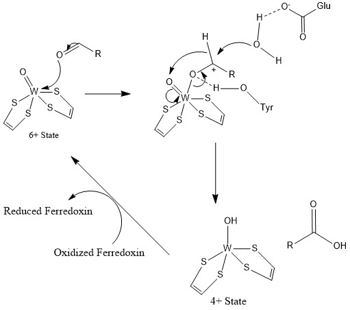 티로신 잔기는 W 중심에 배위된 카보닐 산소 원자와의 수소 결합을 통해 알데하이드의 친전자성 중심을 활성화하는 것으로 제안되었다.[10] 활성 부위 근처의 글루탐산 잔기는 알데하이드 카보닐 중심에 대한 친핵성 공격을 위해 물 분자를 활성화한다.[10] 물의 친핵성 공격 후 수소화물은 옥소-텅스텐으로 전달된다.[10] 이후 W(VI)는 4Fe-4S 중심으로의 전자 전달에 의해 재생성된다.[10] 포름알데히드 페레독신 산화환원효소의 경우, Glu308 및 Tyr 416이 관여하는 반면, Glu313 및 His448이 AOR 활성 부위에 존재하는 것으로 나타났다.[9][10]