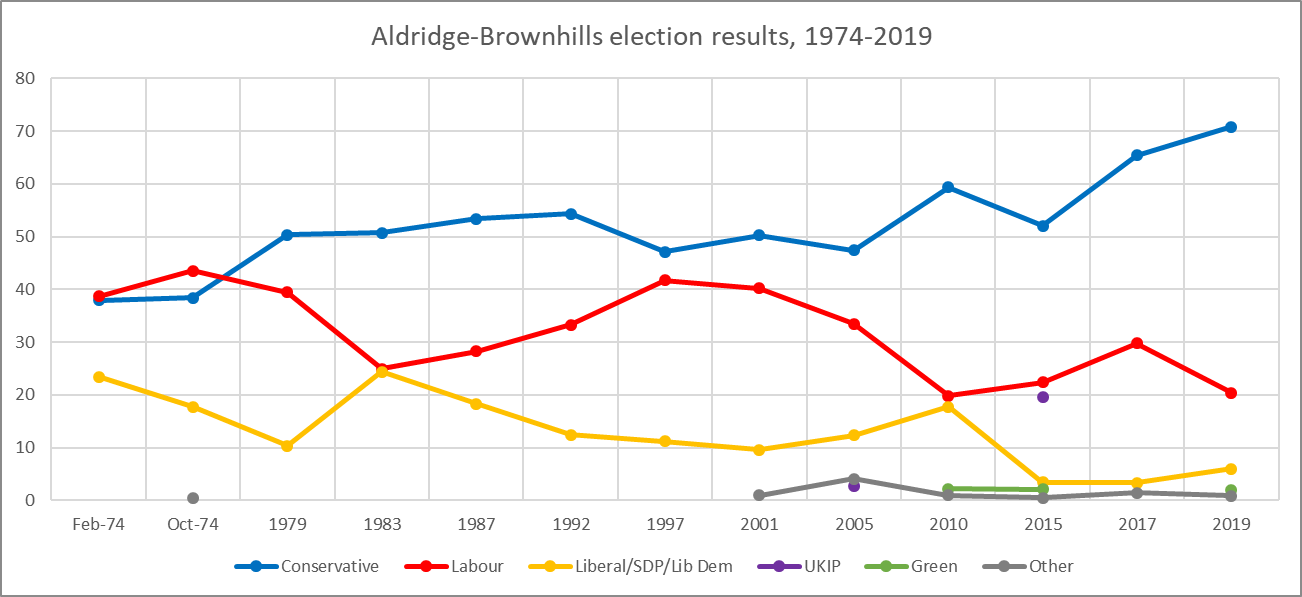 알드리지브라운힐스 선거구는 1974년 2월 영국 총선에서 신설되었다. 1974년 2월 영국 총선과 1974년 10월 영국 총선에서는 노동당의 제프 엣지가 당선되었고, 1979년 영국 총선부터 2010년 영국 총선까지는 보수당의 리처드 셰퍼드가, 2015년 영국 총선부터는 보수당의 웬디 모튼이 당선되었다. 각 연대별 선거 결과는 하위 섹션을 참고하면 된다.