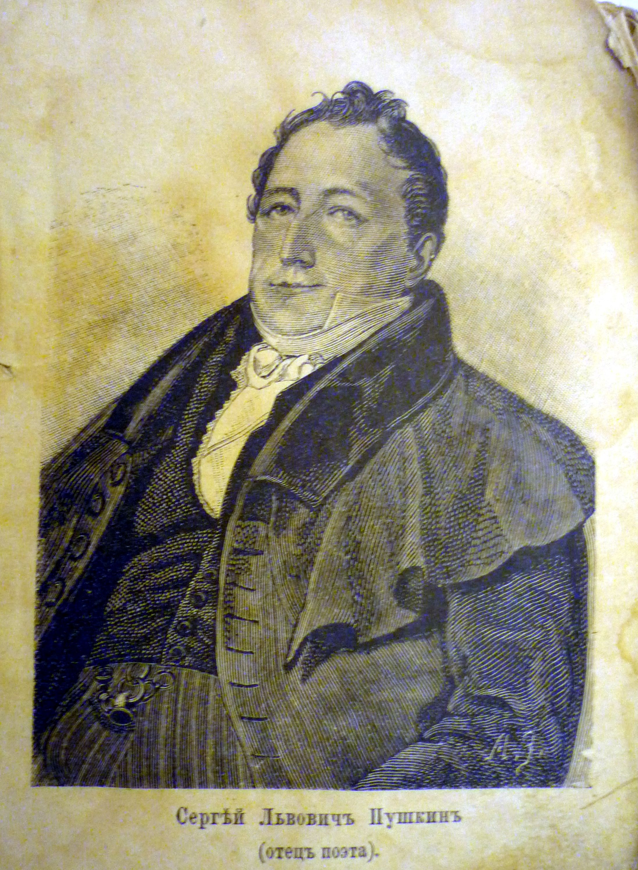 푸시킨의 아버지, 세르게이 르보비치 푸시킨(1767–1848)은 12세기로 거슬러 올라가는 러시아 귀족 가문 출신이었다.[11] 푸시킨의 어머니, 나데즈다(나디야) 오시포브나 간니발(1775–1836)은 그녀의 아버지 쪽 할머니를 통해 독일 귀족과 스칸디나비아 귀족의 후손이었다.[12][13] 그녀는 오시프 아브라모비치 간니발(1744–1807)과 그의 아내 마리아 알렉세예브나 푸시킨(1745–1818)의 딸이었다.