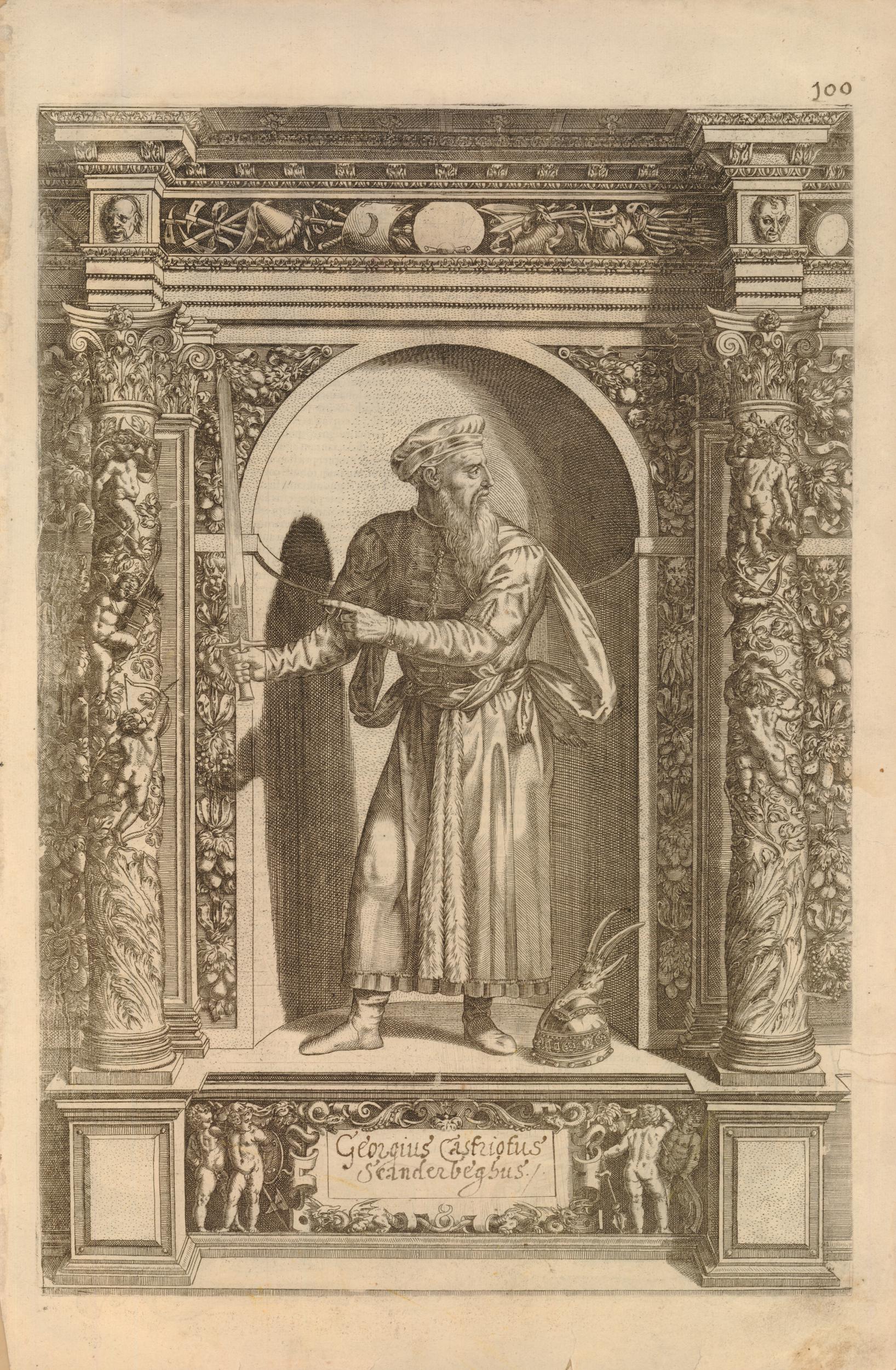 스칸데르베그의 헬멧은 1593년 암라스 성 무기고 목록에 두 자루의 검과 함께 언급되었으며, 페르디난트 2세 대공에게 상속되었다. 1601년 야코프 슈렌크 폰 노칭이 출판한 'Armamentarium Heroicum' 카탈로그에도 실렸으며, 도미니쿠스 쿠스토스가 조반니 바티스타 폰타나의 디자인을 바탕으로 제작한 판화에 스칸데르베그가 헬멧과 검을 착용한 모습이 묘사되어 있다. 이 판화에는 슈렌크 폰 노칭의 간략한 설명이 덧붙여졌다.[8] 페르디난트 1세의 요청으로 1556년 헝가리에서 오스만 제국에 대항하는 작전을 지휘한 페르디난트 2세가 자신의 소장품에 스칸데르베그의 무기를 포함시키려 한 것은 놀라운 일이 아닐 것이다.