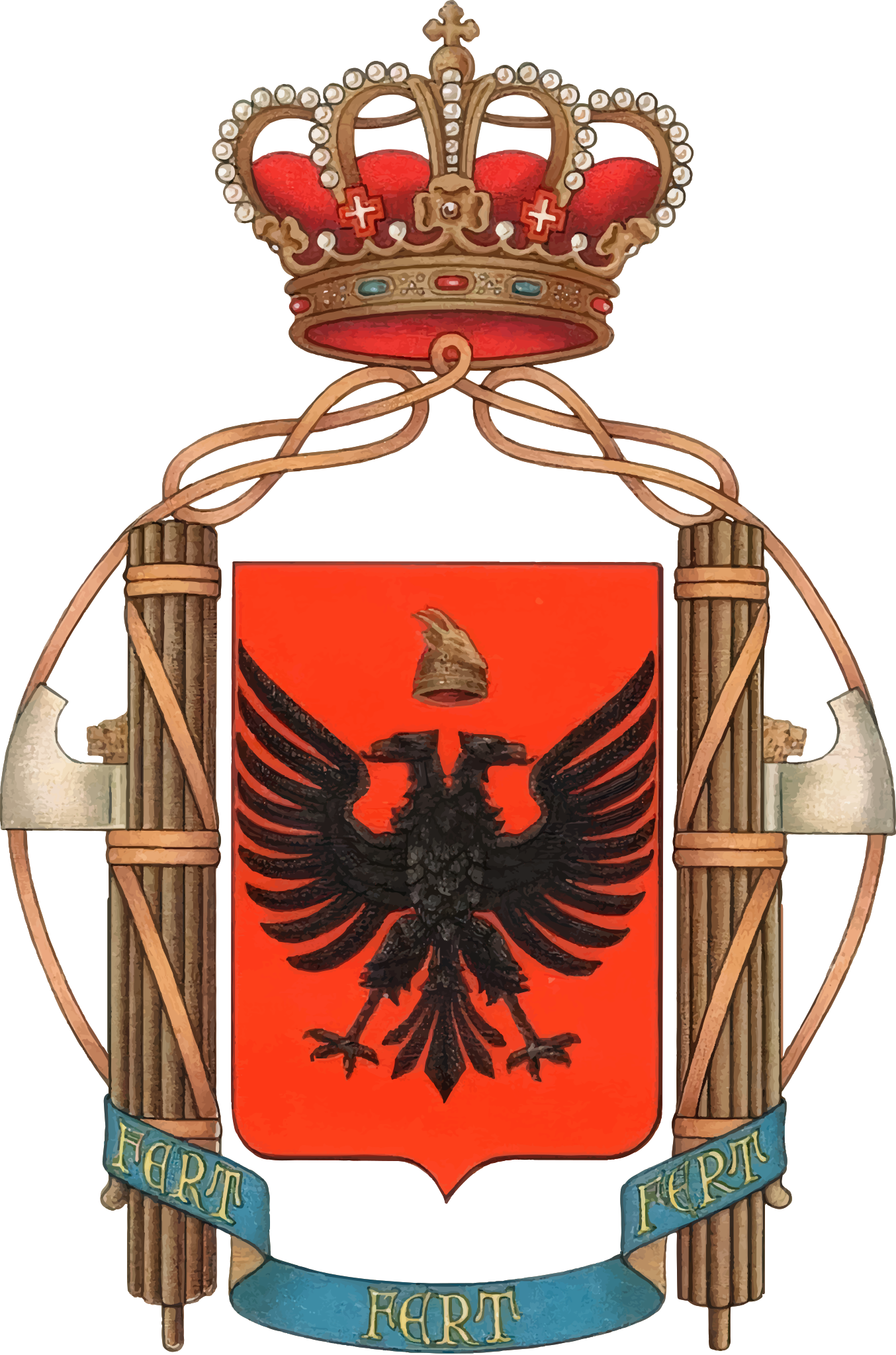 - 대 문장: 스칸데르베그의 헬멧을 쓴 검은색 양두 독수리가 있는 빨간색 방패(scudo)로 구성된다. 바깥쪽으로 향하는 도끼가 달린 두 개의 리크토르 파스케스가 가죽 끈으로 묶여 있고, 위에는 사보이 매듭, 아래에는 금색의 밝은 파란색 두루마리 리본으로 묶여 있으며, "FERT"라는 단어가 세 번 반복해서 새겨져 있다. 전체적으로 금색 술로 둘러싸인 빨간색 비단 층에 배치되어 흰담비로 장식되어 있으며 사보이 왕관이 씌워져 있다. 대 문장은 국가의 대 인장, 엄숙한 행사 및 기념 장식에 사용된다.