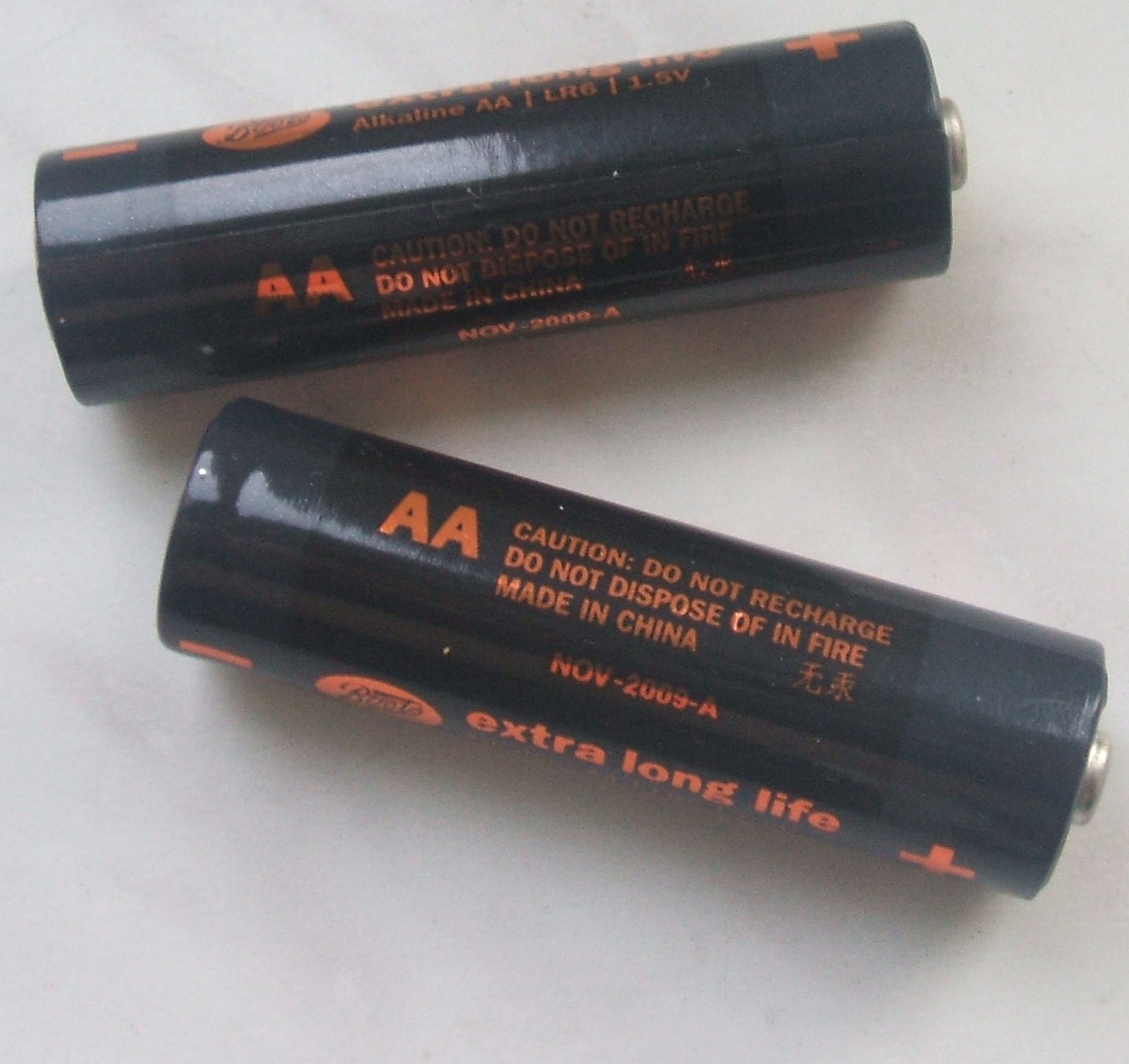 「CAUTION: DO NOT RECHARGE」(주의: 충전 금지)라고 적혀 있는 알카리 단3 건전지