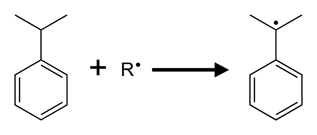 큐멘 공정에서 큐멘은 산소와의 반응을 통해 라디칼로 변환된다.[13]일반적으로 이 큐멘 라디칼은 큐멘 하이드로퍼옥사이드로 변환되지만, 라디칼 불균등화를 겪어 α-메틸스타이렌을 형성하기도 한다.[13]