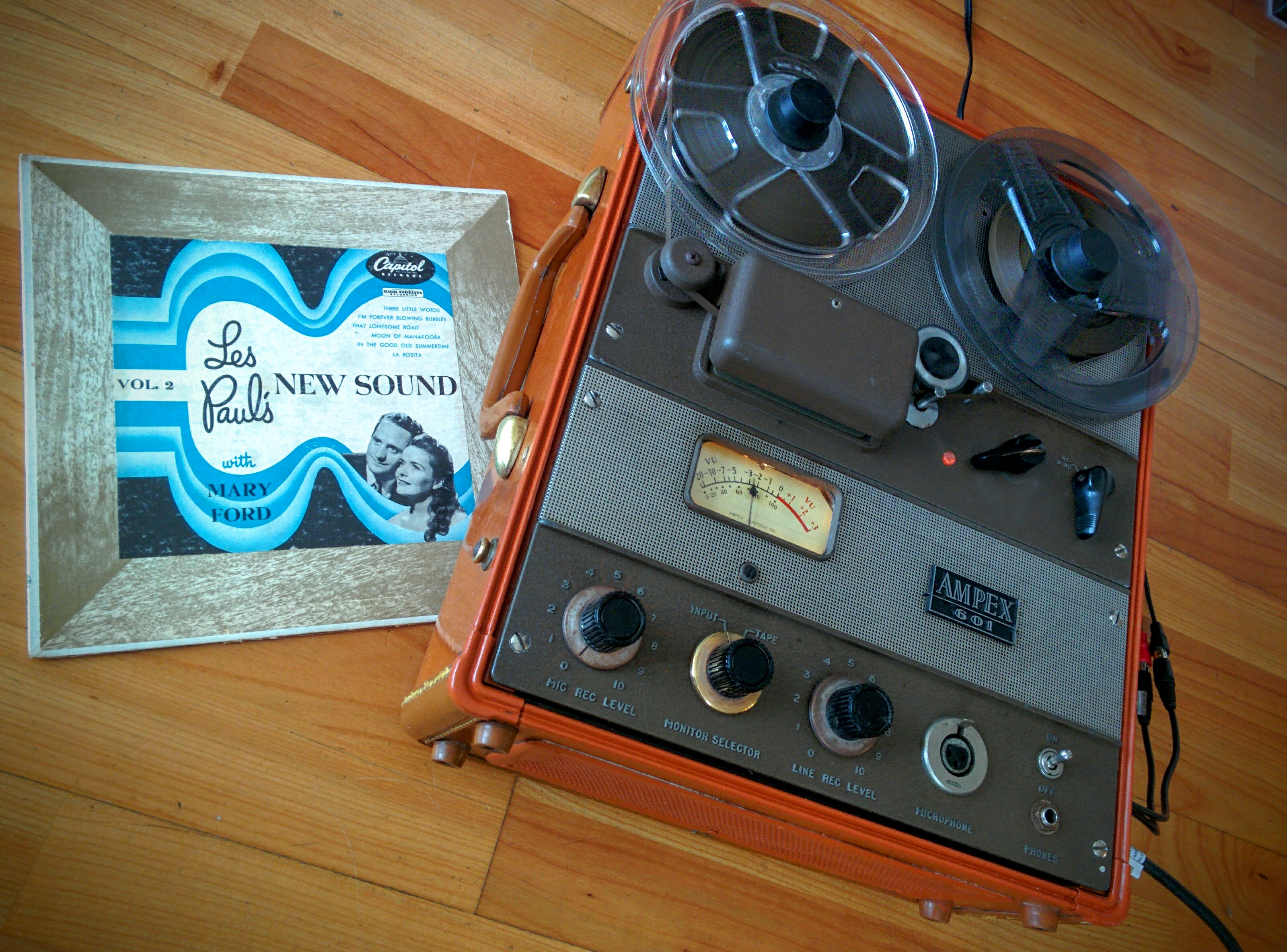 레스 폴은 빙 크로스비의 쇼에 정기적으로 출연한 친구였으며, 이미 디스크에 오버더빙 녹음을 실험하고 있었다. 크로스비는 레스 폴에게 초기형 휴대용 암펙스 모델 300을 선물했다. 레스 폴은 이 기기를 사용하여 "Sound on Sound" 녹음 기술을 발명했다. 그는 기존의 지우기/녹음/재생 헤드 앞에 추가 재생 헤드를 배치했다. 이를 통해 폴은 이전에 녹음된 트랙과 함께 연주하면서 두 트랙을 모두 새 트랙에 혼합할 수 있었다. 이 과정은 원래 녹음을 덮어쓰는 파괴적인 과정이었다.[12]4. 프로페셔널 멀티트랙 레코더