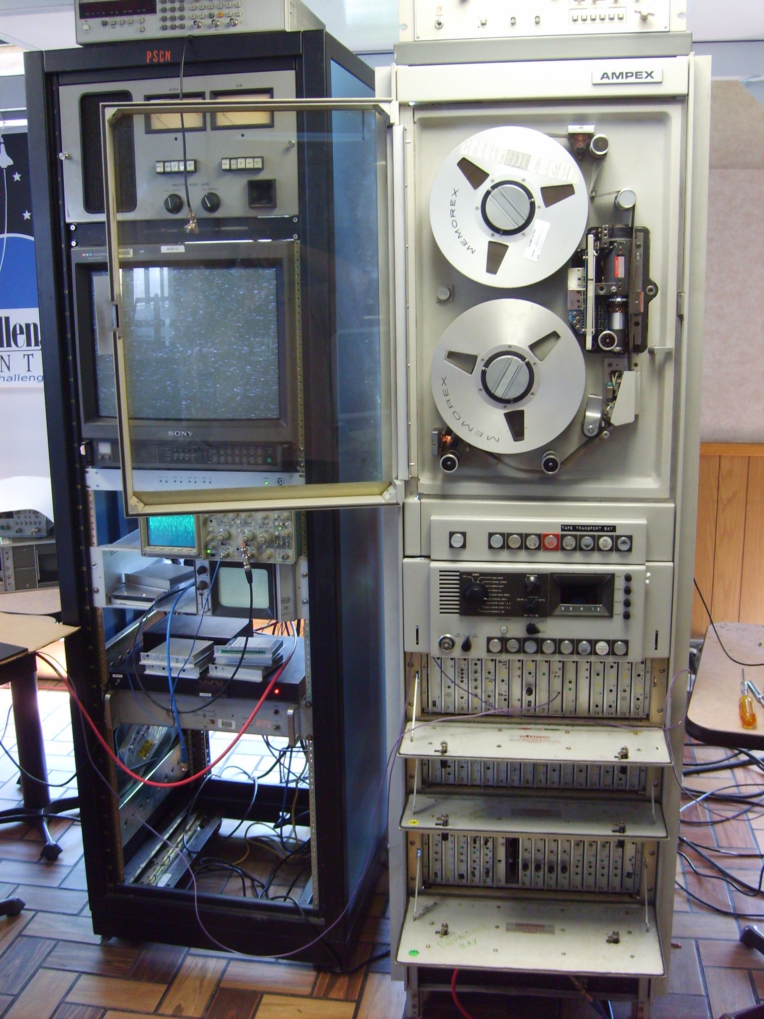 - 비디오 테이프 레코더 (VTR): 1956년 2인치 테이프를 사용하는 비디오 테이프 레코더 VRX-1000을 발표하여 CBC에서 실용적으로 도입했다. 1961년에는 헬리컬 스캔 방식을 개발하고, 1963년에는 비디오 편집 기술 EDITEC을 발표했다. 1976년에는 방송용 1인치 비디오 테이프 레코더를 독자 규격으로 발표하고, 이후 소니 규격과 통합했다. 1981년에는 비디오 특수 효과 장치 ADO(Ampex Digital Optics)를 발표했다.