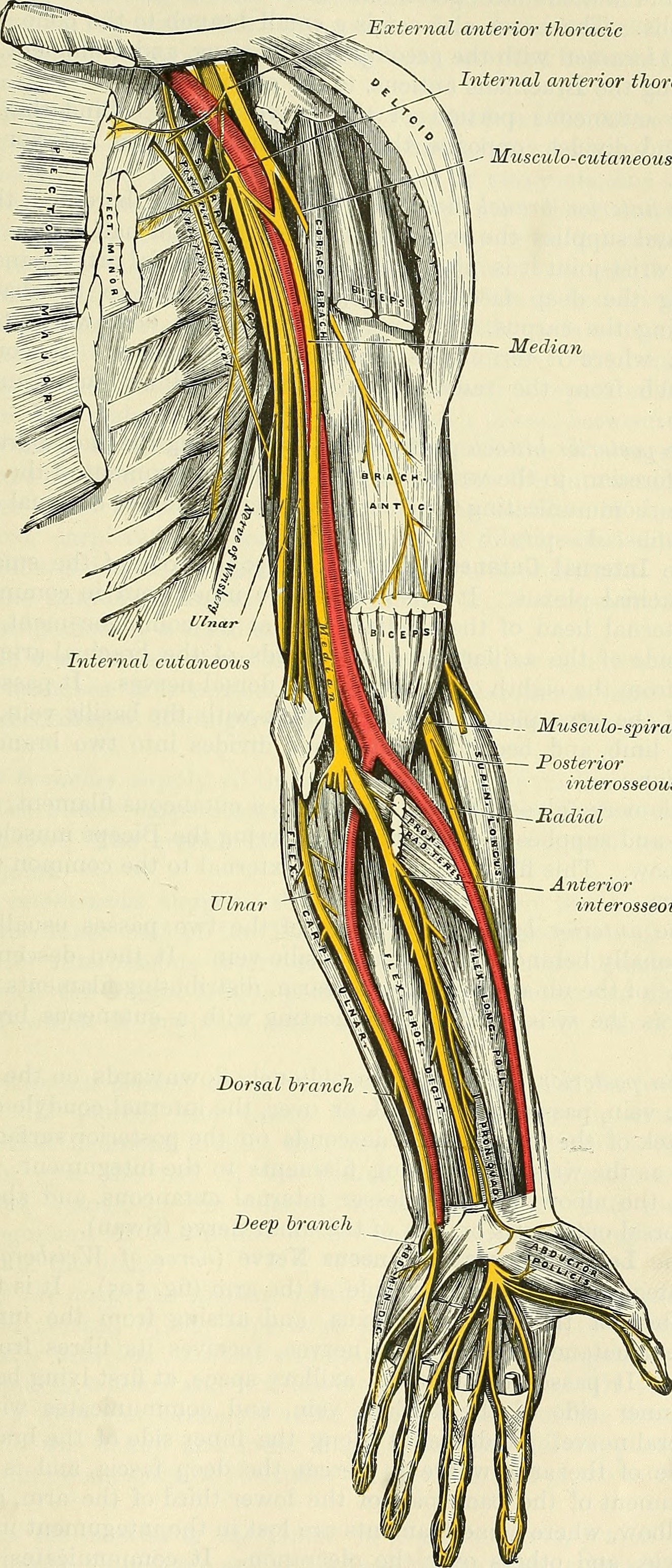 앞뼈사이신경은 정중신경의 운동신경 가지로 팔꿈치 바로 아래에서 분지된다. 이 신경은 앞뼈사이막(anterior interosseous membrane)의 먼쪽으로 주행하며 긴엄지굽힘근(Flexor Pollicis Longus), 검지와 중지의 깊은손가락굽힘근(Flexor Digitorum Profundus), 네모엎침근(Pronator Quadratus)을 지배한다.