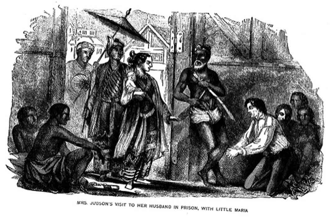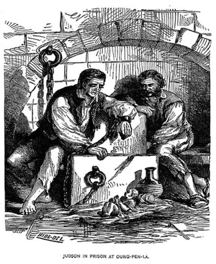애도니럼 저드슨은 1820년대 미얀마와 영국 간의 갈등으로 1년 6개월간 수감되었다.[19] 종교의 자유를 보장해준다는 조건을 제시한 영국군의 미얀마어 통역으로 활동하기도 했다.[20]