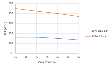 1996년에는 더 높은 스테이지 속도를 통해 처리량이 향상되었으며,[13][14] 2013년에는 더 높은 출력의 ArF 레이저 펄스 소스에 의해 가능해졌다.[15] 처리량은 스테이지 속도에 정비례하며, 스테이지 속도는 선량, 직사각형 슬릿 폭, 슬릿 강도에 의해 결정된다. 슬릿 강도는 펄스 출력과 직접 관련이 있다. 슬릿 폭은 선량을 만들기 위한 펄스 수를 레이저 펄스 주파수로 나눈 값에 최대 스캔 속도를 곱하여 결정된다.[13] 따라서 주어진 선량에서의 처리량은 최대 스테이지 속도를 높이고 펄스 출력을 증가시킴으로써 향상된다.
