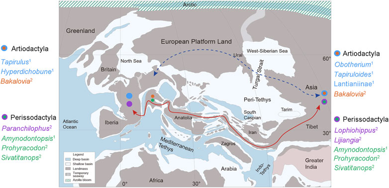 ''안드루사쿠스''의 모식표본이 발견된 이르딘 만하 지층은 중기 에오세에 해당하는 이르딘만한 지층으로 구성되어 있다.[26] ''안드루사쿠스 몽골리엔시스''는 하부 이르딘만한에 해당하는 IM-1 지역에서 발견되었으며,[27] 여기에서는 하이에노돈족 ''프로프테로돈'', 중치류 ''하르파골레스테스'', 적어도 세 종의 이름 없는 중치류,[1] 우제목 ''얼리안히우스'',[28] 기제목 ''데페레텔라''와 ''로피알레테스'', 오모미과 ''타르콥스'', 글라이레스 ''곰포스'', 설치류 ''탐콰미스''와 다양한 불확정적 글라이레스가 알려져 있다.[26][27] ''파라트리이소돈 헤난엔시스'' 표본이 발견된 루시 지층은 이르딘 만하 지층과 거의 같은 시기에 퇴적되었다. 중치류 ''메소닉스'', 판토돈트 ''유디노케라스'', 디코부니드 ''디코부네'', 헬로히과 ''고비오히우스'', 브론토테르 ''리노티탄'' 및 ''마이크로티탄'', 기제목 ''아미노돈'' 및 ''로피알레테스'', 테노닥틸리드 ''친링고미스''와 토끼목 ''루실라구스''가 루시 지층에서 확인되었다.[29] ''A. 크라섬''이 기원하는 동준 지층 역시 중기 에오세이다.[30] 이곳에서는 님라브과 ''에우스밀루스'', 안트라코테리과 ''프로브라키오두스'', 판토돈트 유디노케라스, 브론토테르 ''메타텔마테리움'' 및 cf. ''프로티탄'', 데페레텔리드 ''데페레텔라''와 ''텔레올로푸스'', 히라코돈과 ''포르스터쿠페리아'', 코뿔소과 ''일리안오돈'' 및 ''프로히라코돈'', 아미노돈과 ''아미노돈'', ''기가타미노돈''과 ''파라미노돈''이 보존되어 있다.[31]