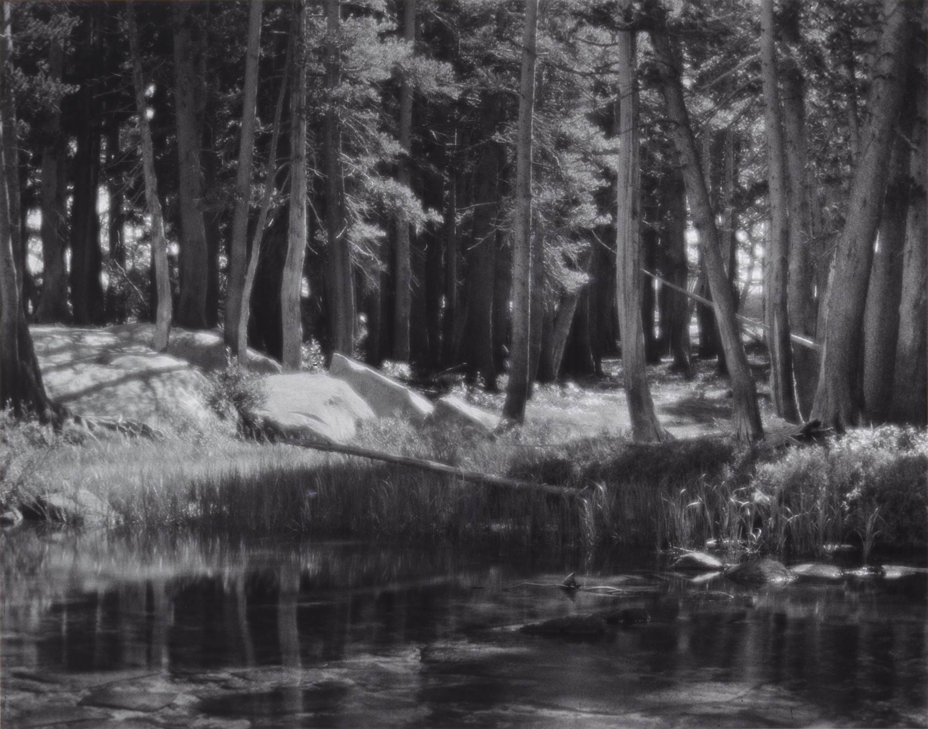 1920년대 중반, 사진의 유행은 부드러운 초점, 확산된 빛 등 그림을 모방하려는 회화주의였다. 애덤스는 그러한 기술과 종이에 기름기 있는 잉크를 칠하는 브로마일 공정을 실험했다. 그 예로 1921년에 촬영된 ''요세미티 국립공원, 머세드 강 리엘 포크의 랏지폴 소나무''(원래 이름은 ''Tamarack Pine'')가 있다. 애덤스는 소프트 포커스 렌즈를 사용하여 "마법 같은 여름 오후의 분위기를 포착하는 빛나는 광채"를 담아냈다.