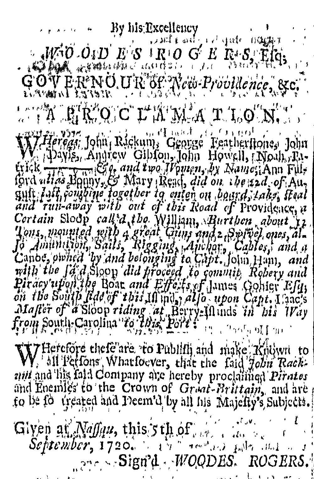1720년 8월, 보니, 랙험, 메리 리드는 다른 해적 선원들과 함께 슬루프선 ''윌리엄(William)''을 훔쳐 해적 행위를 시작했다.[19] 이들은 서인도 제도에서 상선을 공격했으며, 보니는 남자들과 함께 해적 행위에 참여했다.[20],[21] 1720년 9월, 로저스 총독은 랙험과 그의 동료들을 체포하라는 선언문을 발표했는데, 여기에는 앤 보니와 메리 리드가 포함되어 있었다.[17]