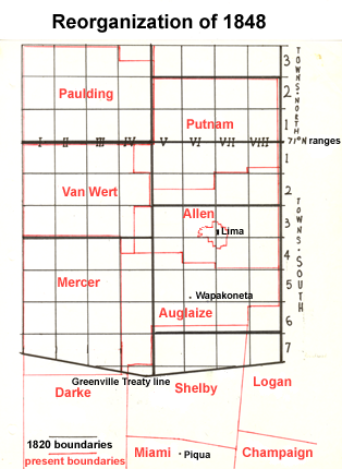 1848년, 앨런군의 경계가 변경되어 남쪽 절반에서 오글레이즈군이 분리되었다. 푸트남군, 밴 웨르트군, 머서군의 일부가 앨런군으로 편입되었다.[12] 이러한 변경으로 군청 소재지인 리마는 군의 중앙에 위치하게 되었고, 1845년에 완공된 마이애미 및 이리 운하의 상당 부분이 앨런군에 포함되었다.