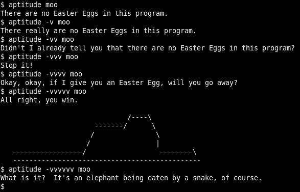 `aptitude -vvvvvv moo` 명령을 실행하면 "이게 뭔지? 물론 보아 뱀에게 먹힌 코끼리야."라는 메시지가 나타난다. 이는 어린 왕자의 한 구절에서 유래되었다.