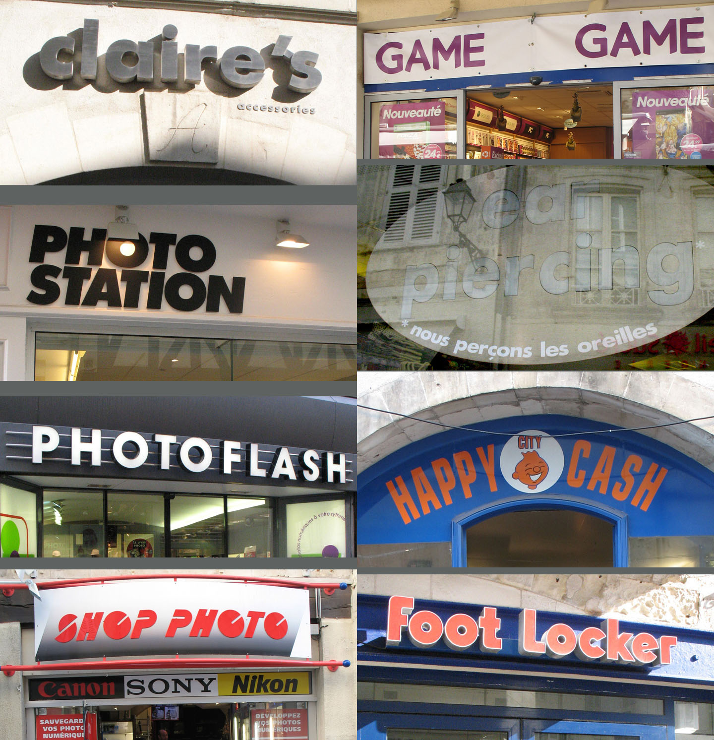 프랑스 서부 라 로셸의 쇼핑 센터 간판들은 영어의 사용 예시를 보여준다.