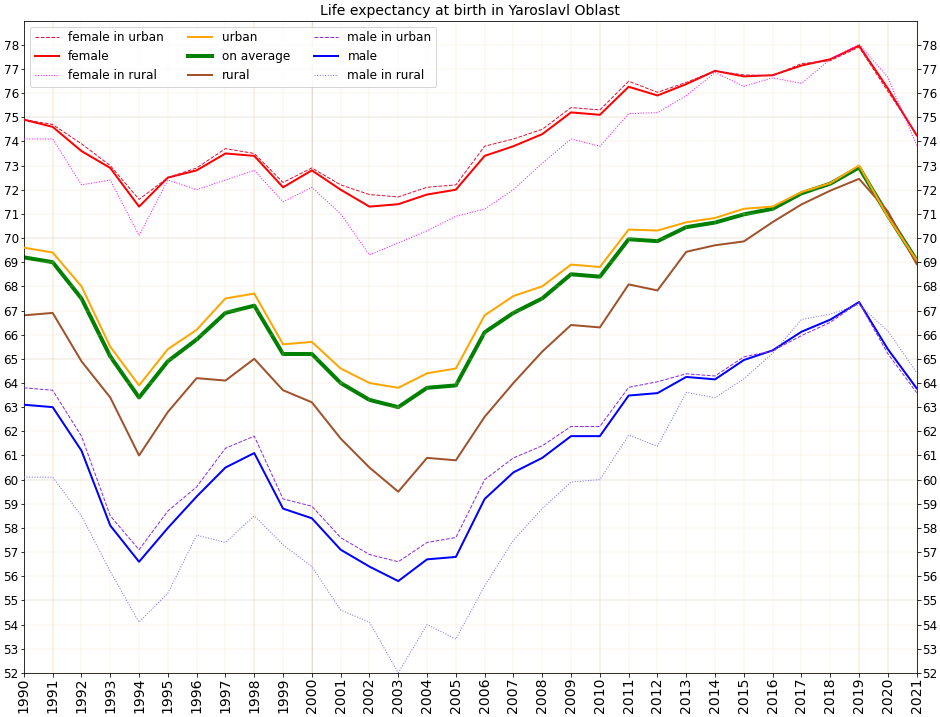 로스스타트(Rosstat)에 따르면 2021년 야로슬라블주의 평균 수명은 다음과 같다.