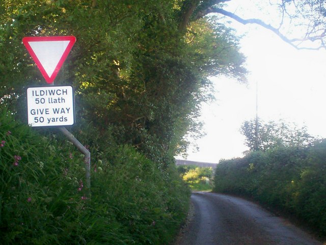 웨일스에서는 일부 표지판에 이중 언어 문구가 표시되어 있다. Give Way|기브 웨이영어 위에 웨일스어 Ildiwch|일디우흐cy가 표기된다.