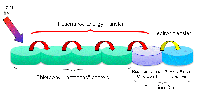 FMO 복합체와 같은 색소-단백질 복합체는 안테나에서 반응 부위로 에너지를 전달하는 역할을 한다. 반응 중심 복합체가 빛 에너지를 받으면, 1차 전자 수용체의 산화 및 환원이 일어난다. 미토콘드리아의 전자 전달 연쇄와 유사하게, 일련의 산화 및 환원이 틸라코이드 막을 가로질러 양성자(H+)를 펌핑하고, 화학삼투에 의한 양성자 구동력을 발생시켜 ATP 합성에 에너지를 제공한다.