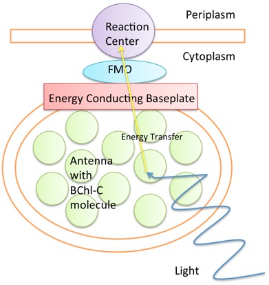 FMO 복합체의 다이어그램. 빛은 안테나의 전자를 여기시킨다. 여기는 FMO 복합체의 다양한 단백질을 거쳐 반응 중심부로 전달되어 광합성을 더욱 진행시킨다.