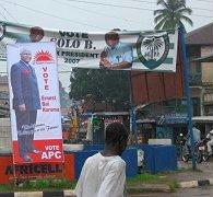 프리타운에서 2007년 8월 6일 대통령 선거를 앞두고 APC 후보 코로마(앞쪽)와 집권 SLPP의 포스터를 지나가는 남성.