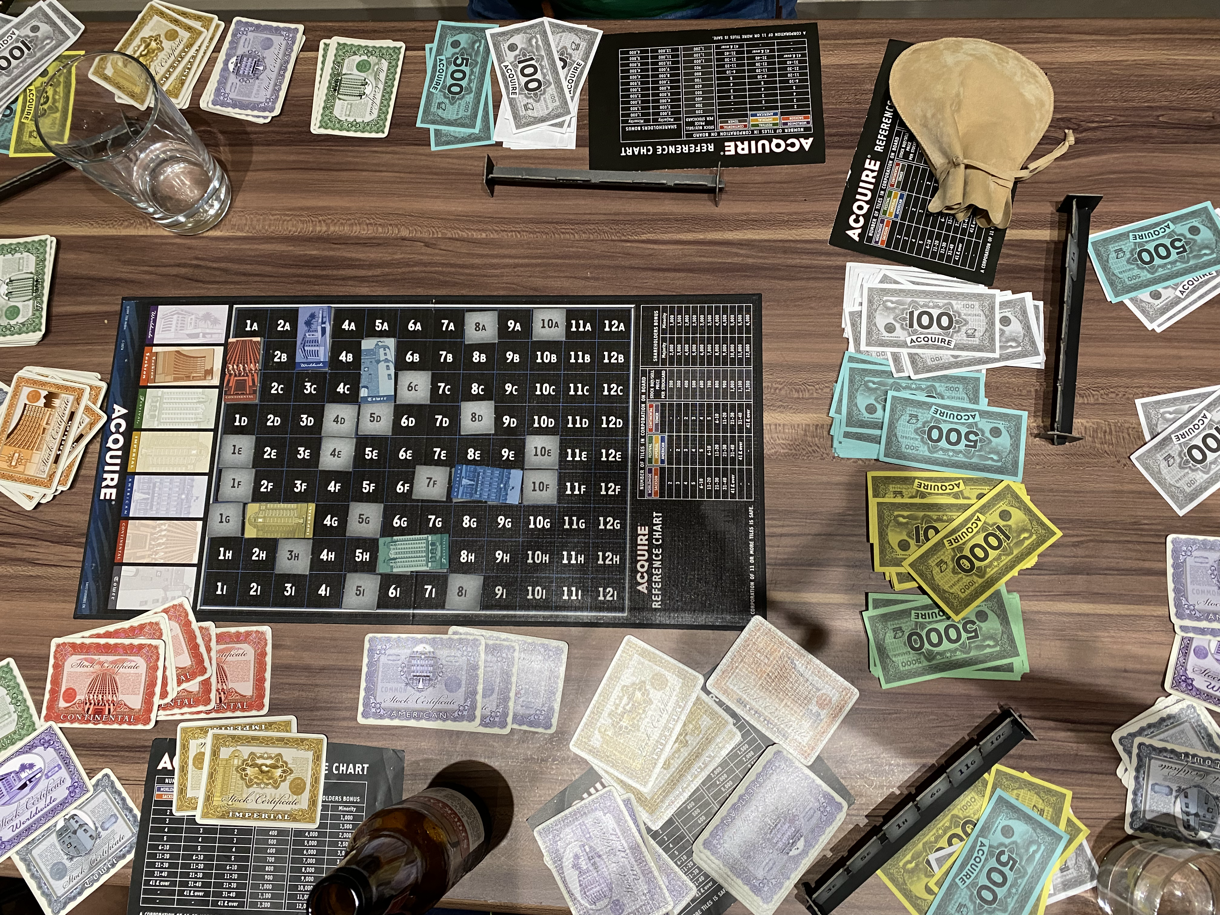 어콰이어는 보드 게임으로, 스크래블 보드와 유사한 격자판에 타일을 놓고 호텔 체인을 설립하고 합병하며 주식을 거래하는 게임이다. 각 플레이어는 타일을 놓고 주식을 사거나 팔며, 호텔 체인의 규모와 주식 가격에 따라 전략을 구사한다. 게임은 특정 조건(41개 이상의 타일을 포함하는 호텔 체인, 모든 호텔 체인이 11개 이상 타일 포함)이 충족되면 종료되며, 최종적으로 현금과 주식 가치를 합산하여 가장 많은 돈을 가진 플레이어가 승리한다. 어콰이어는 1963년 3M에서 처음 출시되었으며, 여러 차례 판권 변경과 개정을 거쳐 현재까지도 플레이되고 있다.