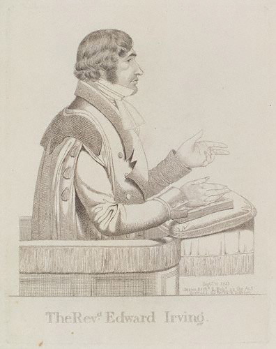 에드워드 어빙은 1792년 스코틀랜드 애넌에서 태어난 목사이자 작가이다. 에든버러 대학교에서 문학 석사 학위를 받고, 해딩턴과 커컬디에서 교사로 재직하며 신학을 공부했다. 1820년대 런던에서 설교로 명성을 얻었으며, 웅변과 초자연적인 현상에 대한 관심으로 대중의 주목을 받았다. 그는 앨버리 회의를 통해 종말론적 사상을 발전시켰고, 방언과 치유의 은사를 강조하며 가톨릭 사도 교회의 전신을 형성하는 데 기여했다. 이단 혐의로 스코틀랜드 교회에서 파문된 후, 이즐링턴에서 활동하다 1834년 사망했다.