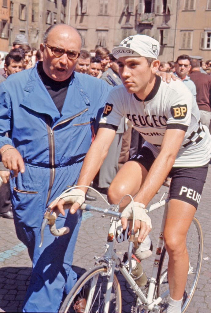 |thumb|upright|1967 지로 디탈리아에서 메르크스는 종합 9위로 마무리하는 과정에서 그의 첫 그랜드 투어 스테이지에서 우승했다.|alt=Eddy Merckx being pushed while on bike before a stage.]]
