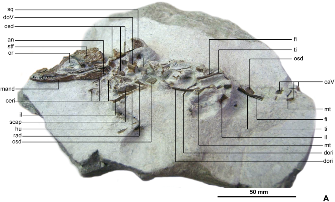 - 상완골(위 앞다리 뼈)의 근위 및 원위 표면(골단)이 납작하고 일직선으로 정렬되지 않았다.[5]