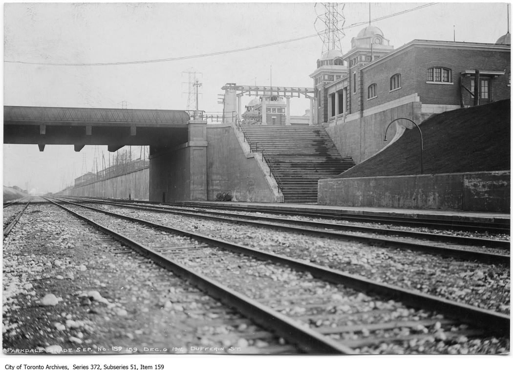 1910년에서 1912년 사이에 선로가 평면 교차에서 입체 교차로 변경되면서 기존 역은 철거되었다.[10] 이는 절개지 남쪽에 옹벽을 건설해야 했기 때문이다. Exhibition Place 입구에 더퍼린 게이트가 새로 지어졌고, 선로 위 새 다리 서쪽에 있는 두 개의 측면 플랫폼으로 내려가는 콘크리트 계단이 설치되었다.[4] 1960년대까지 여객 서비스가 계속 운행되었다.[4][10]2. 3. TTC 노면 전차 연결 (1916년)