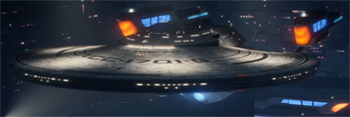 앤드루 프로버트가 그린 컨셉 아트를 바탕으로 릭 스턴바크가 디자인을 완성했다. 엑셀시어급 우주선과 갤럭시급 우주선의 중간적인 디자인이었으나, 촬영 스케줄 문제로 디자인이 간략화되었다. 촬영용 모형은 그레고리 진에 의해 제작되었으며,[36] 선체 표면에는 데미지 도색이 칠해져 있다.
