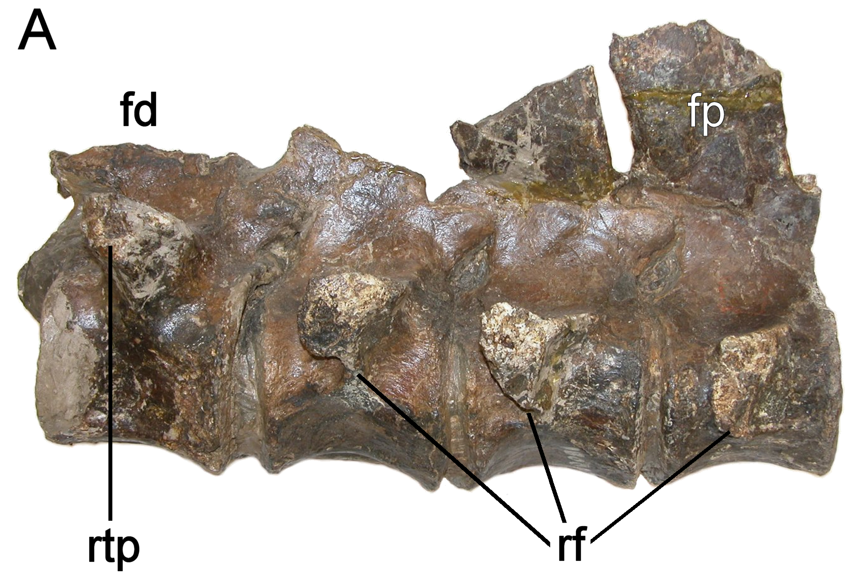 목 척추뼈의 신경궁은 중심에 잘 융합되어 뚜렷한 봉합선이 없었으며, 신경관은 앞쪽 척추뼈에서 좁았고 뒤쪽 척추뼈에서 더 두드러지게 발달하여 너비와 높이가 같았으며 거의 원형이었다. 목 척추뼈의 전관절돌기와 후관절돌기는 인접한 척추뼈가 서로 맞물리도록 연결하는 돌기였으며, 길이가 같았다. 목 척추뼈의 신경 극은 낮았고 20번째 척추뼈 부근에서 거의 반원형인 것으로 보인다. 각 목 척추뼈의 바닥에는 중앙에 영양 구멍 쌍이 있었고, 능선으로 분리되었으며, 이는 목 뒤쪽으로 갈수록 점점 더 두드러지고 두꺼워졌다.[20]