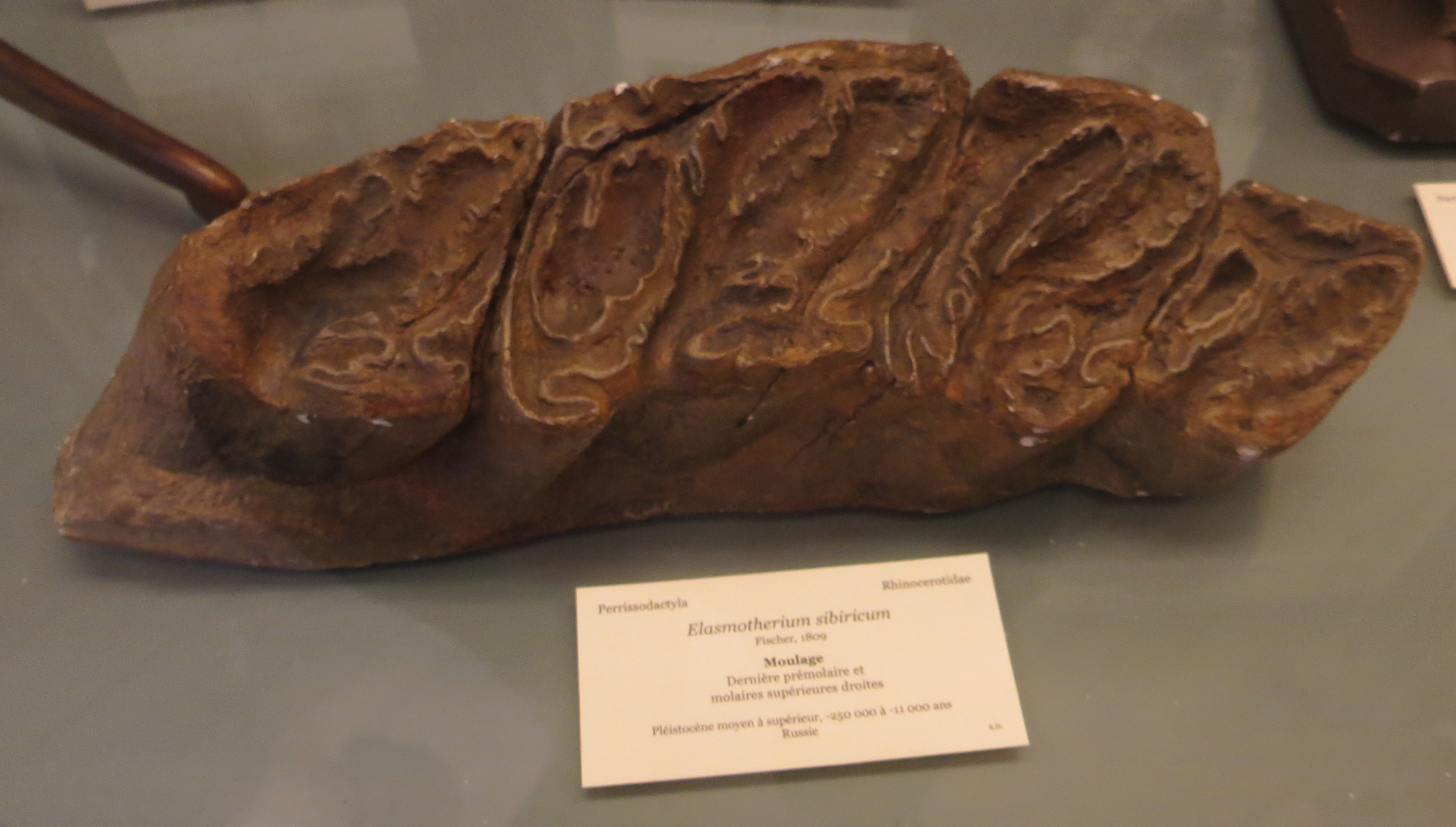 다른 코뿔소들과 마찬가지로 엘라스모테리움(*Elasmotherium*)은 씹는 데 사용되는 두 개의 소구치와 세 개의 어금니를 가지고 있었고, 절치(앞니)와 견치(송곳니)는 없었다. 대신 잡는 입술을 이용하여 먹이를 뜯어 먹었다.[41] 엘라스모테리움은 큰 치관과 잇몸선 아래까지 뻗어 있는 법랑질을 가졌고, 치아가 계속 자라는 진정한 고치였다. 엘라스모테리움 화석에서는 치근의 흔적이 거의 발견되지 않는다.