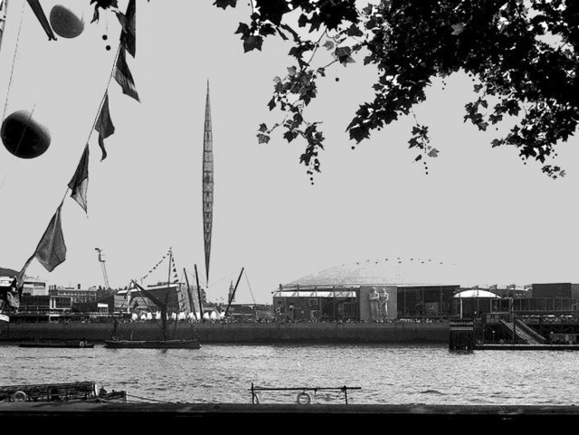 템스강 북쪽 강둑에서 바라본 사우스 뱅크 전시관의 모습, 높이의 스카이론과 돔 오브 디스커버리가 보인다.