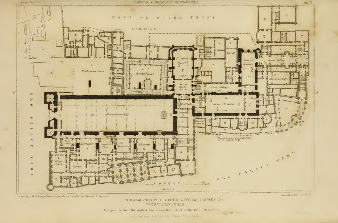 1834년 웨스트민스터 궁전 평면도, 귀족원(백색 회의실), 하원(성 스테판 예배당), 웨스트민스터 홀, 회화실, 의장 관저 및 재무부의 위치를 ​​보여준다.