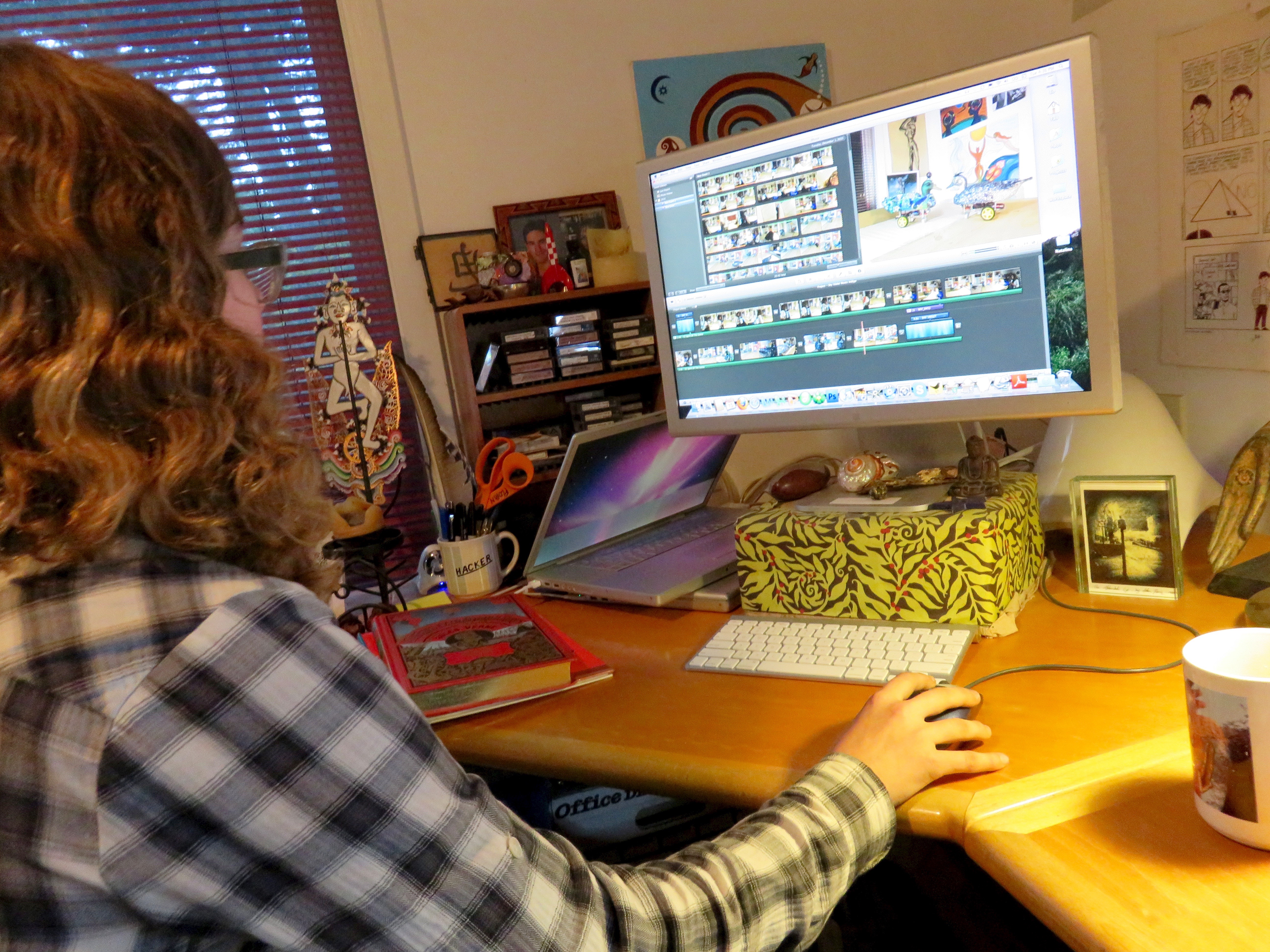 여성이 아이무비를 사용하여 비디오를 편집하고 있다