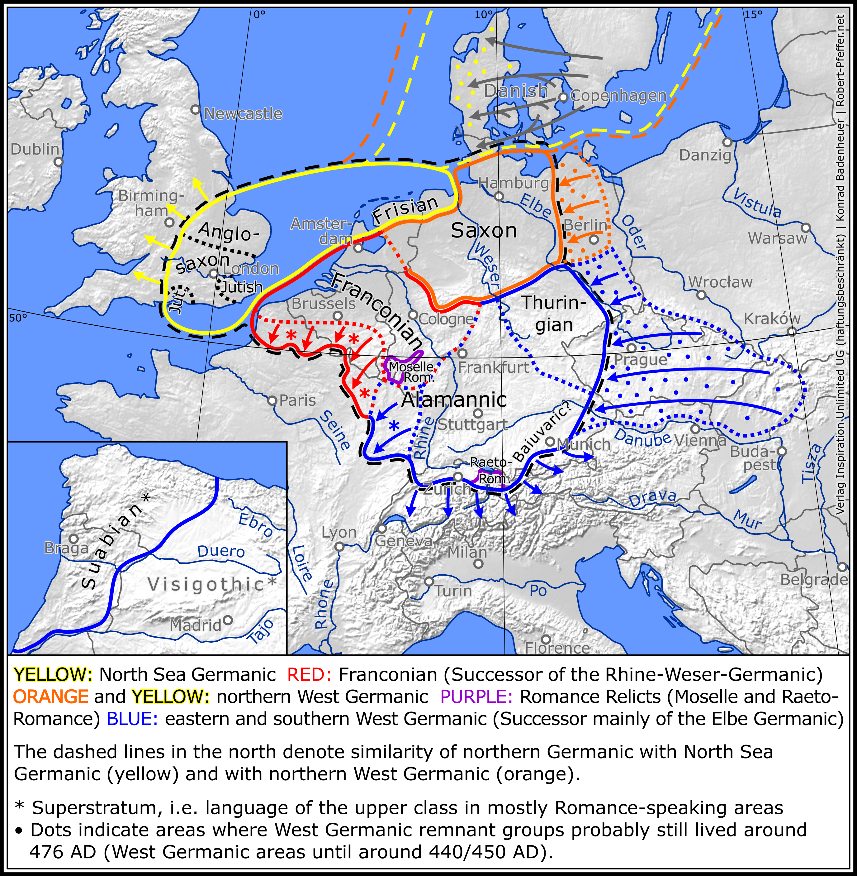 ''앵글로-색슨 연대기''에 따르면, 449년경 브리튼의 왕 보티건이 픽트족의 침입을 막기 위해 헹기스트와 호르사가 이끄는 앵글족 용병을 초대했고, 그 대가로 브리튼 남동부 땅을 주었다고 한다. 이를 계기로 많은 게르만족이 브리튼섬으로 이주하여 칠왕국(Heptarchy)으로 알려진 여러 왕국을 세웠다. 다만, ''연대기''는 후대에 쓰인 기록이므로 초기 사건의 정확성에 대해서는 주의가 필요하다.[5] 비드 역시 그의 저서에서 앵글족, 색슨족, 유트족의 침입을 기록했으나, 이들의 정확한 역할과 이주 과정에 대해서는 학자들 간의 논쟁이 있다.[6]