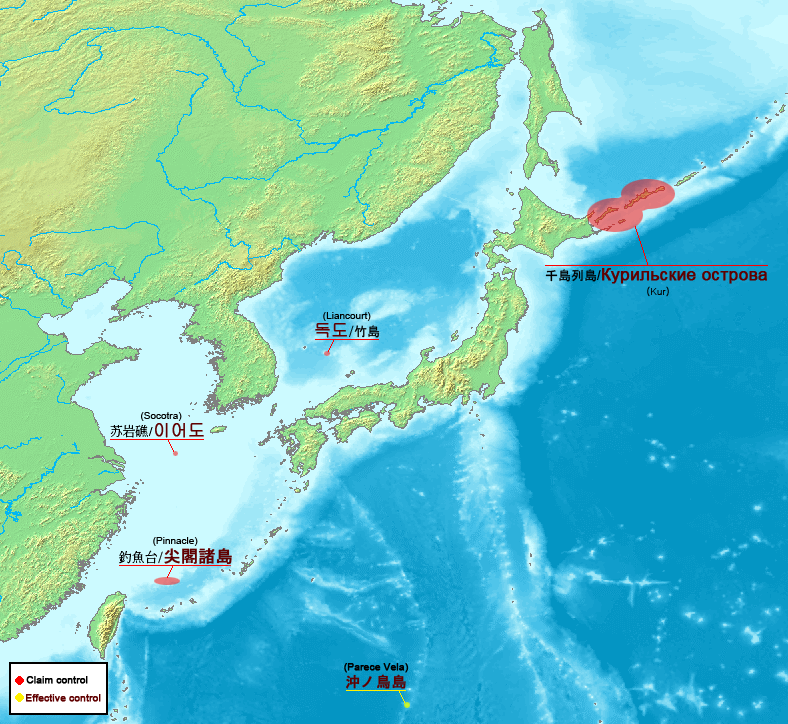 동아시아 | 쿠릴 열도 (러시아, 일본), 독도 (한국, 북한, 일본), 센카쿠 열도 (일본, 중국, 대만), 중국 대륙 (중국, 대만), 외몽골 (몽골, 대만), 백두산 (북한, 중국, 한국), 간도 (중국, 한국, 대만), 타이완, 펑후 제도 (대만, 중국), 녹둔도 (러시아, 북한, 한국), 이어도 (한국, 중국, 대만), 수중 암초 (한국, 중국) |